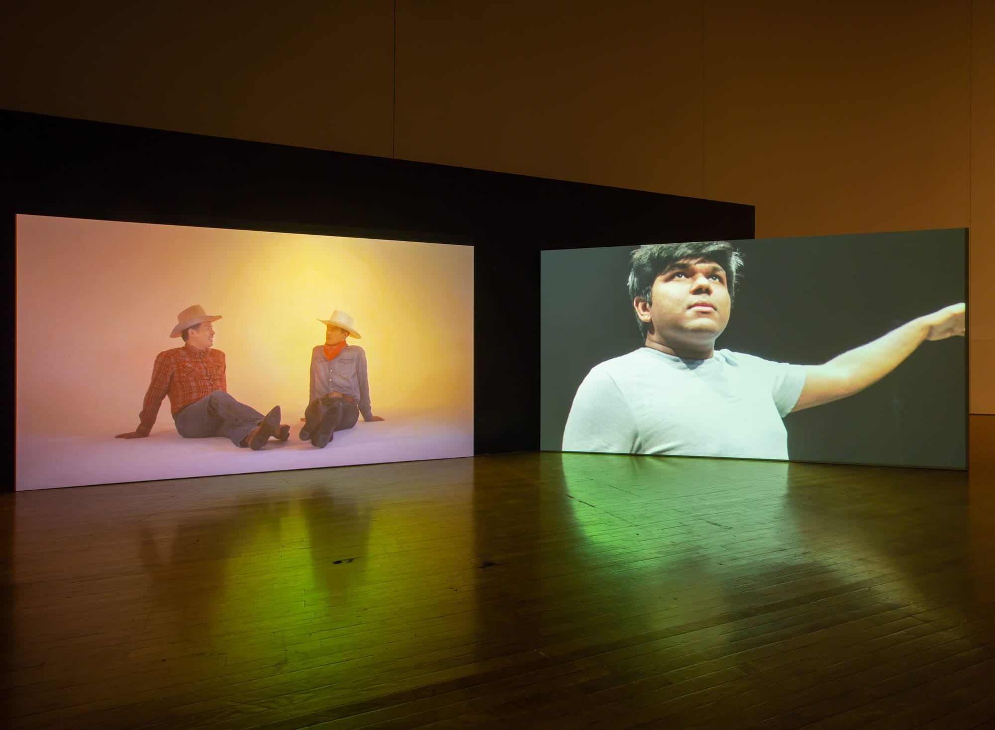Much of Silent Spikes’ two channel video segments feature Asian American men dressed as cowboys, interacting with each other. Some are asked to imitate horse riding, while others conjure how they imagine a 19th-century Asian American cowboy might have danced. Tam focuses his camera on the awkwardness of these imitations, how they have been warped in recollection and given the fact that Asian American men have historically not seen themselves reflected in cowboy imagery. Cut between these scenes, on either screen, are shots of men outside the cowboy simulation, experimenting with movements on a stage. Their strange, improvised contortions make it clear that none are professional dancers. Together with the simulations, their unpracticed motions paint a portrait of Asian American men trying to find themselves in their bodies.