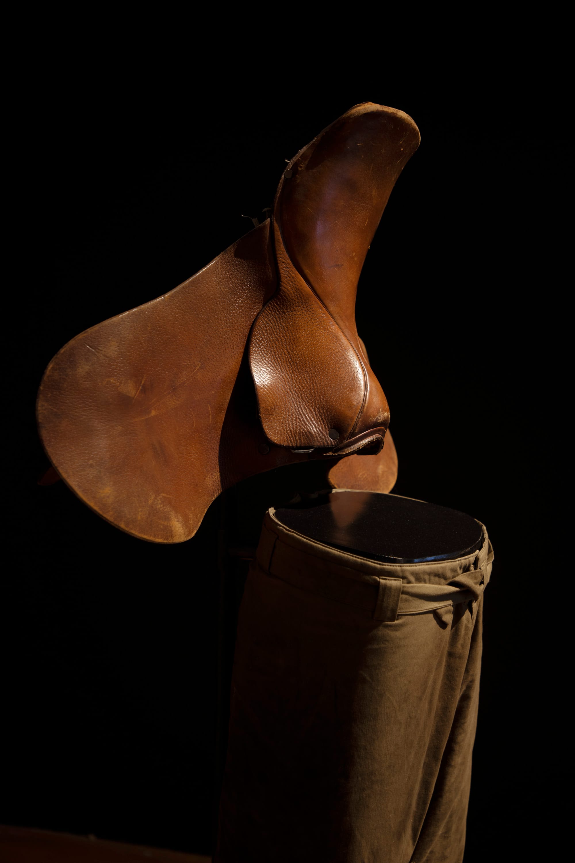 Further upending the cowboy trope, Tam asks his subjects to define sensuality. One individual focuses on the feeling of textures: hair being brushed in the opposite direction that it’s laid, the softness of a material building to a sort of comfortable climax. This idea extends to the two sculptures on display: a Chinese rail worker’s cotton work pants sit in opposition to the hard, coarse denim jeans of the cowboy. From each pair of pants, displayed on either side of the two screens, a saddle protrudes, its fenders splayed out to the side like a spinal cord and arms.