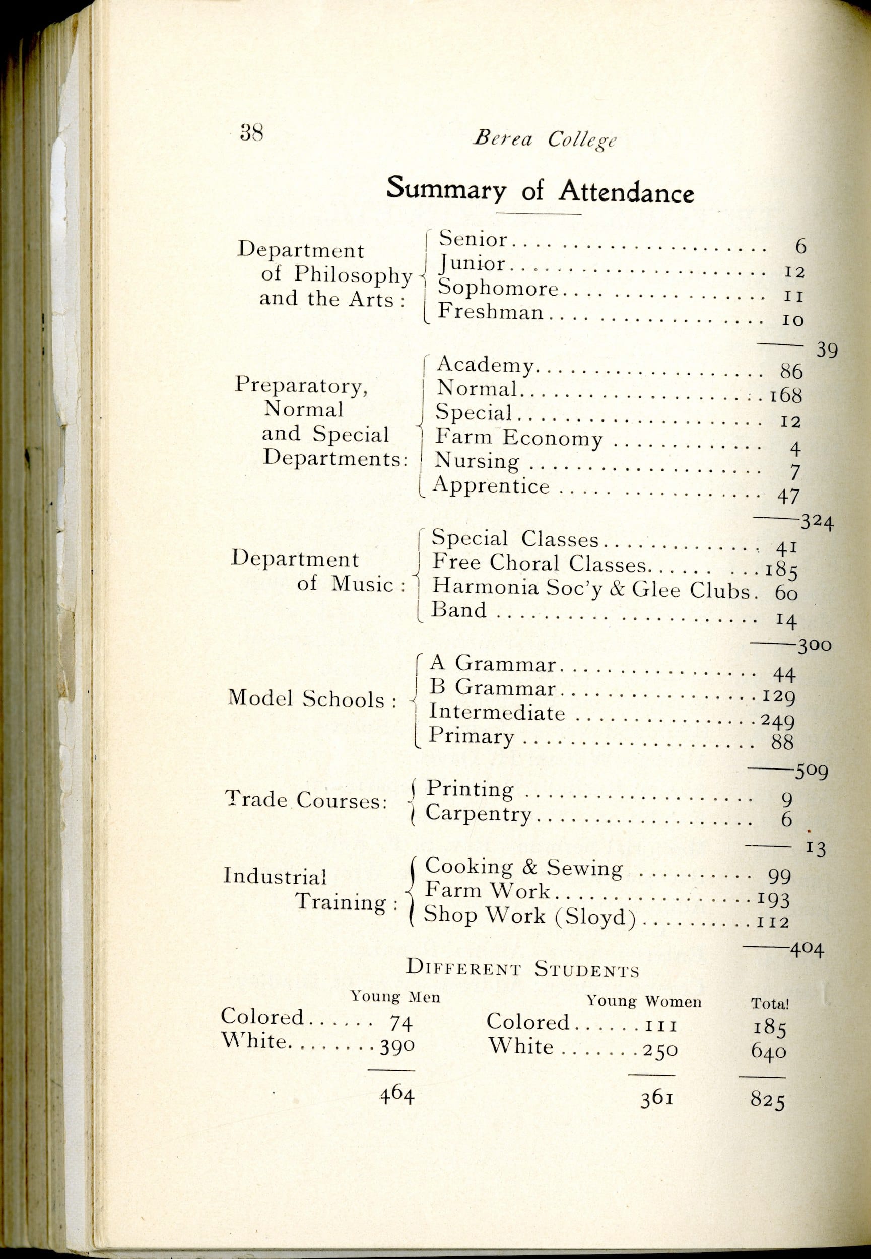 The earliest college catalogue never mentioned industrial education, but the 1889–1890 edition proclaimed that Berea’s “students engage in manual labor to a large extent,” that “plans for Industrial training in the line of trades are under discussion,” and that “an encouraging beginning has been made this year with our printing press.” This training preceded Berea’s Student Craft program, founded in 1893. Not neglecting women, the 1892 catalogue noted that “young ladies also receive special instructions in the making and repairing of garments.”