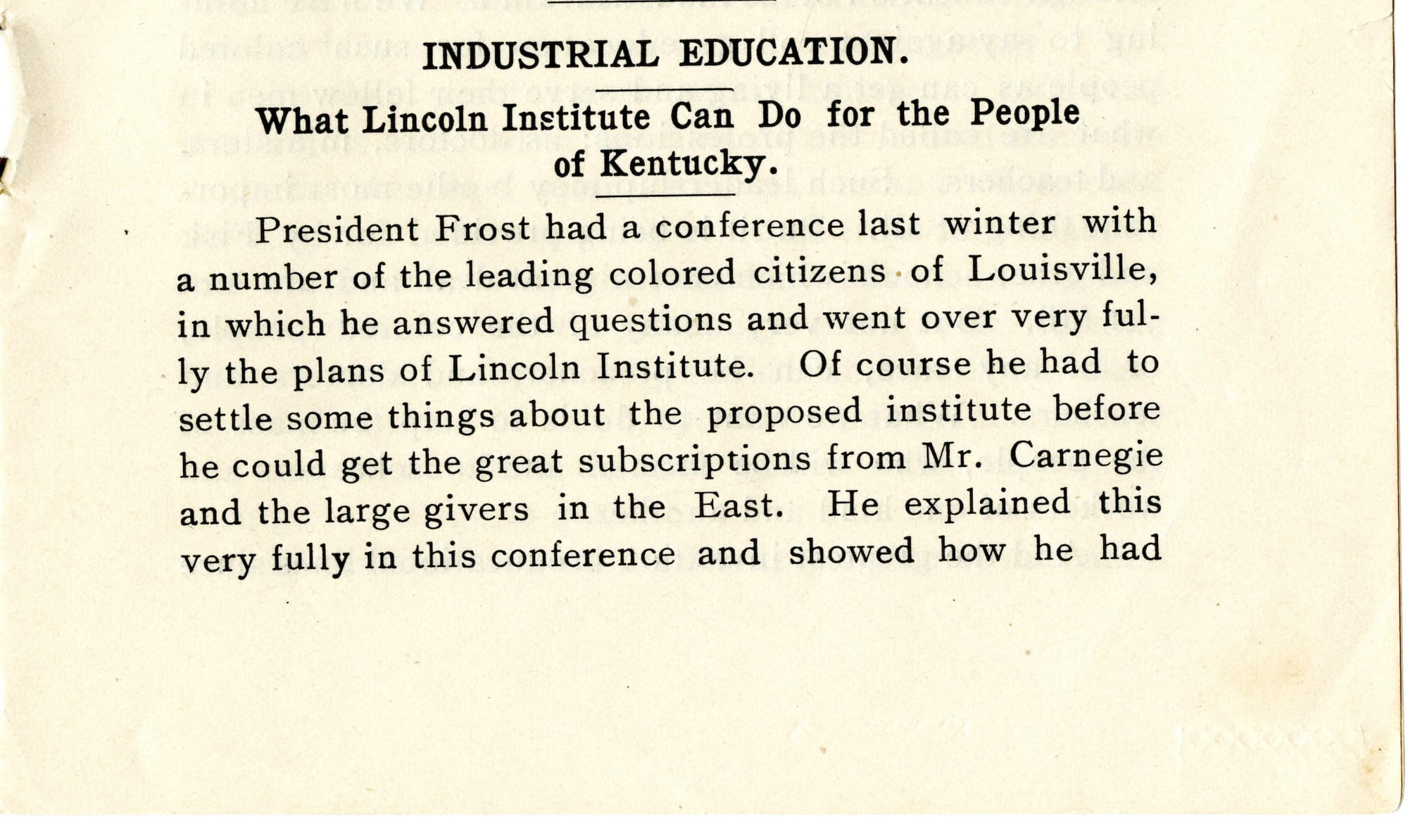 Granted, Frost protested the Day Law and vigorously raised funds for Lincoln Institute, successfully securing a $200,000 matching grant from Andrew Carnegie. But Frost and other supporters also reflected a historical reality that is too often downplayed: Though advocates for the Institute, they also expressed anti-Black ideologies.