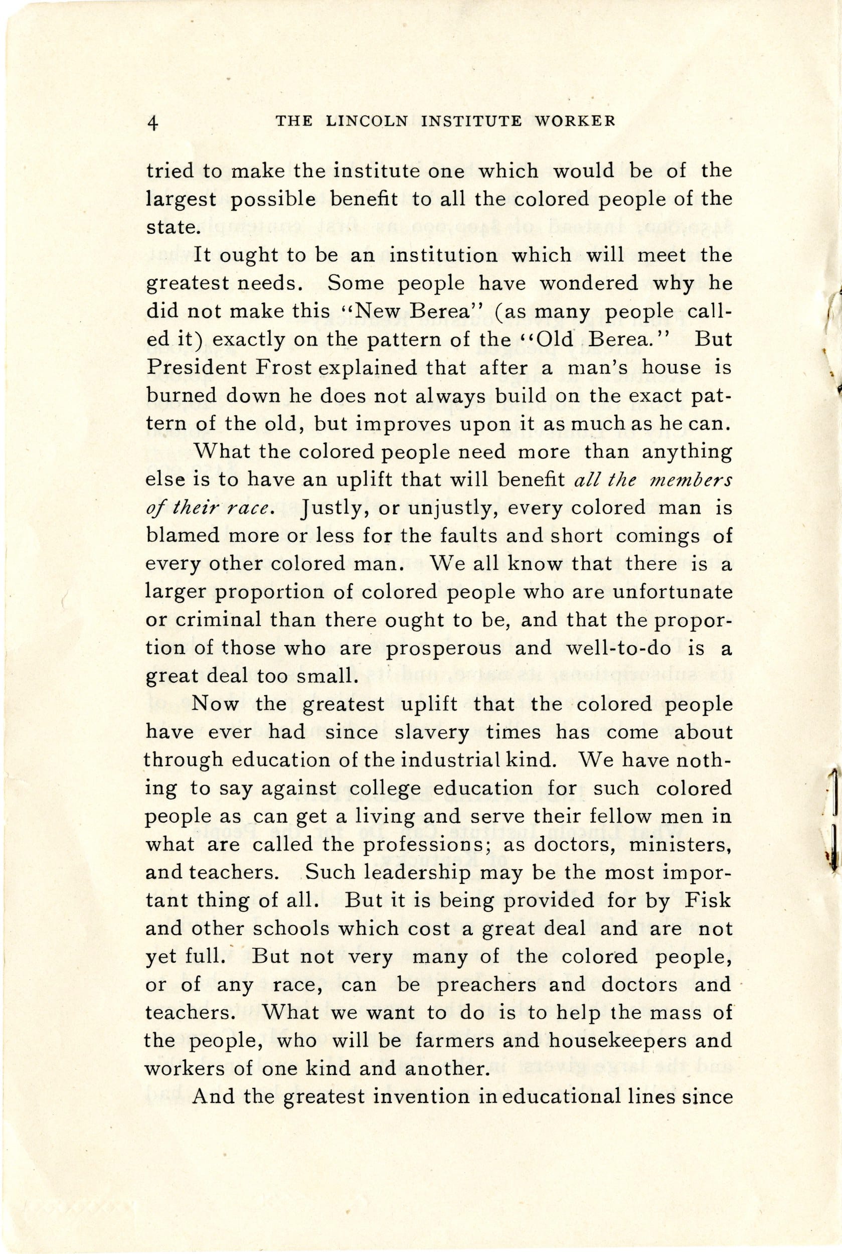 Addressing a crowd of potential Black donors in Louisville, Frost stated his intentions for the school. The Lincoln Worker, written by White and Black supporters and printed by Berea College, reported on the event. Though it’s not clear whether Frost uttered these words or the writers editorialized, their commentary on the capabilities of Black people is unmistakable:
