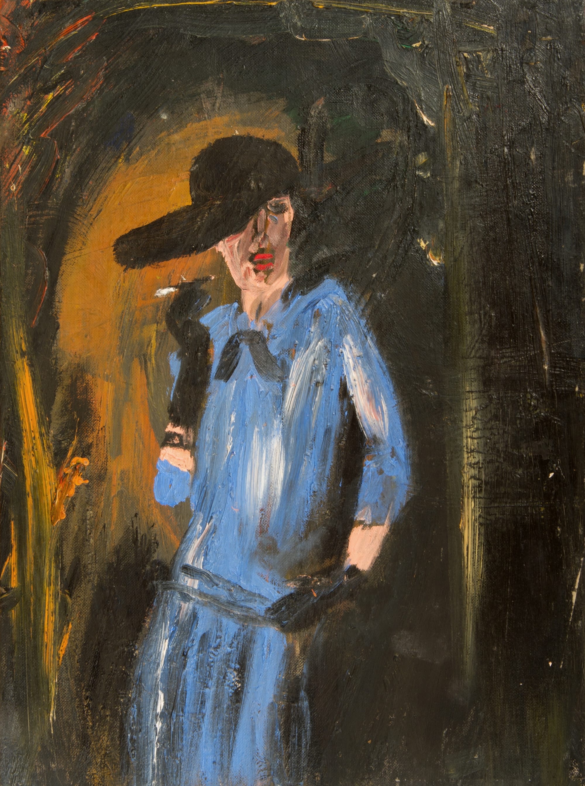 The beauty of these two paintings is that, while we can discern the subject — he in his hat, she in her sleek blue dress — the context in which these figures exist remains blurred in the same way as the echo of a sentence in a Kerouac book or a story told the morning after a long night of cross-country driving. As Francesco Tedeschi states in a catalogue essay: “What emerges from his art is a picture of a personality based on dynamism, on the immediate expression of his way of being and feeling, and on a proud hunger for and love of life.” It’s precisely the personality that emanates from the canvas.