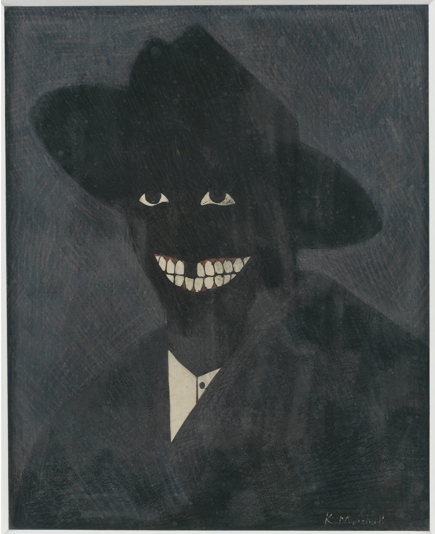 One reason it needs to be retold is that at the time when Marshall painted “A Portrait of the Artist as a Shadow of His Former Self” (1980) in egg tempera, a medium that historically preceded oil painting, many white critics had proclaimed that painting was dead. The painting measures 8 by 6 ½ inches, making many of the large Neo-Expressionist paintings done in these years look overblown and pompous. Inspired by Ralph Ellison’s novel Invisible Man (1952), in which the unnamed black narrator, who recognizes that he is invisible, states: