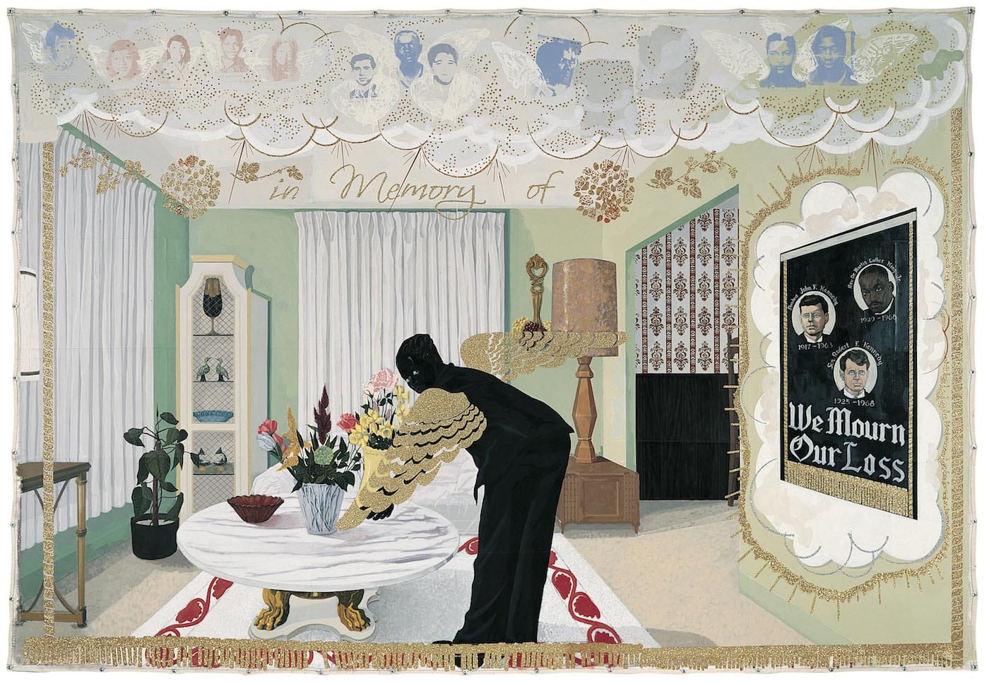 All through the ‘90s, Marshall turned out one majestic painting after another. Prepare to be dazzled, shaken, stirred, challenged, and disturbed. Marshall can be tender and sweet; he can memorialize the dead (from children to Presidents and Civil Rights leaders); he can praise beauty and rewrite history; he can evoke histories and events that have been neglected or glossed over; he can be sardonic; he can evoke fear and embrace anger; and he can be enigmatic. At no point did I feel that he was calling attention to himself or saying, I suffered or felt this. If anything, Marshall has found ways to expand his subjectivity and memories so that the self takes at least one step back. In contrast to Walt Whitman, he embraces multitudes without using “I.” This is what he shares with the great figurative painters, starting with Jean Auguste Dominique Ingres, and including Manet, Georges Seurat, Paula Modersohn-Becker, Frida Kahlo, Jacob Lawrence, Horace Pippin, and Willem de Kooning — an interest in the body, the individual, and groups.