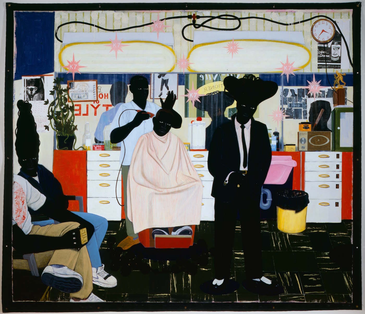 In “De Style” (1993), a breakthrough painting which measures around ten by ten feet, Marshall depicts the interior of a neighborhood barbershop. There are three men more or less occupying the center of the painting, with rays extending out from the barber’s head, suggesting that he is a saint of some sort. On the left, a woman is seated, looking out at the viewer. Her mountain of hair alludes to a traditional African style while being contemporary American at the same time. Seated next to the woman is a partially visible man, whose right hand is adorned with a sleek ring with the word “STUD” spelled out on it.