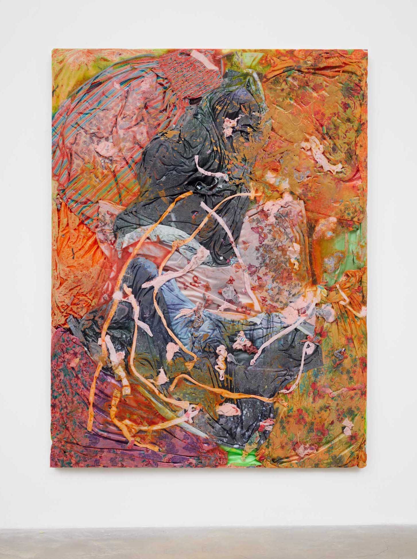 A metamorphosis from soft to hard, “The Road” (2019) alludes to Beasley’s journeys from his hometown of Lynchburg to the annual reunion in Valentines. The work utilizes raw cotton, a recurring material in Beasley’s sculptural practice, from a farm near his family’s home. A resin cast bestows its presumably hard-to-the-touch surface. Similarly, “Field VI” (2020) and “Field II” (2020) comprise a blend of cotton, polyester house dresses (from a Harlem store where Beasley’s grandmothers shopped), and resin. Although made using the formal strategies of assemblage, the works appear as abstract expressionist paintings — replete with vibrant swirls of orange, red, green, and purple.