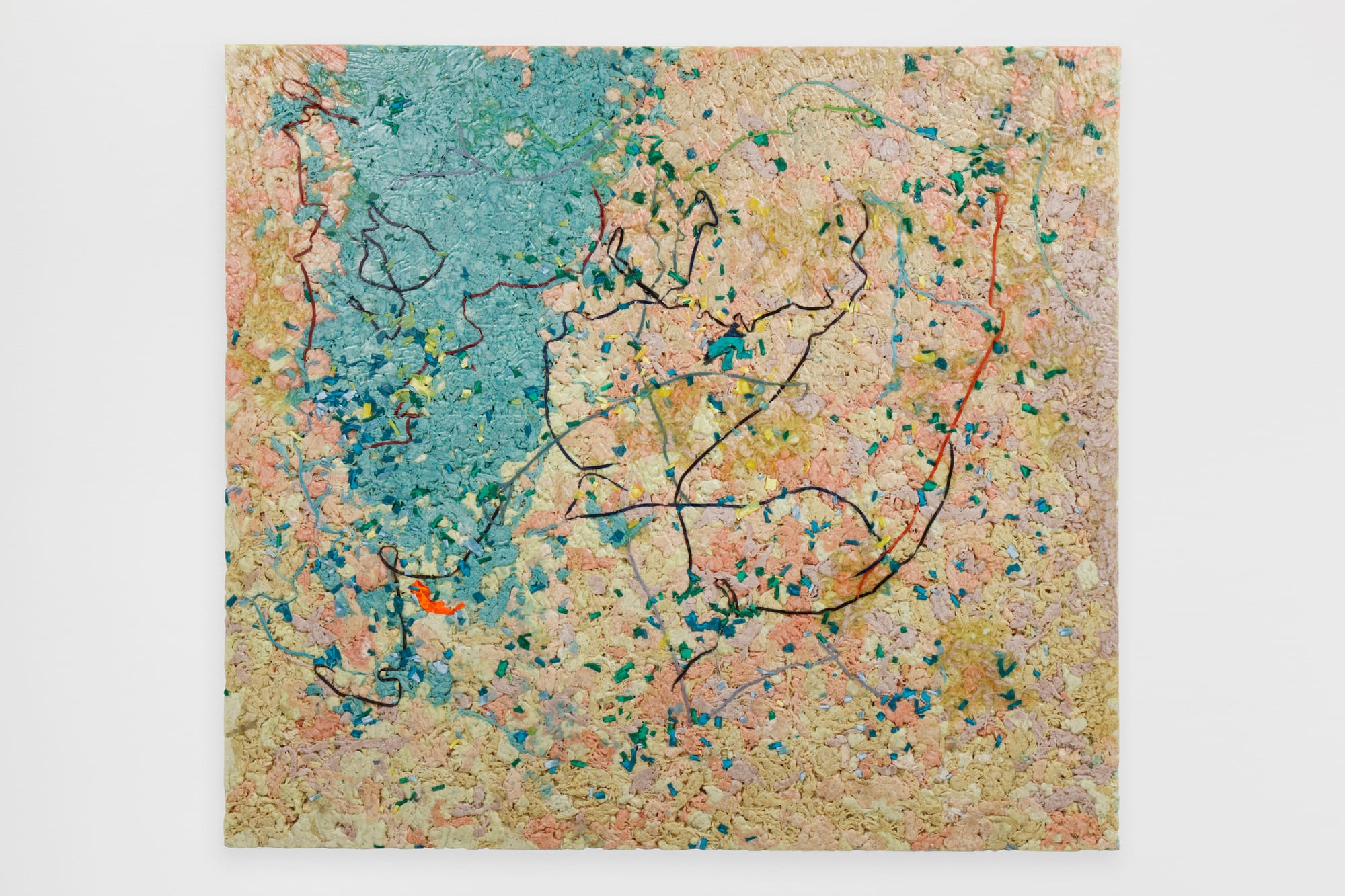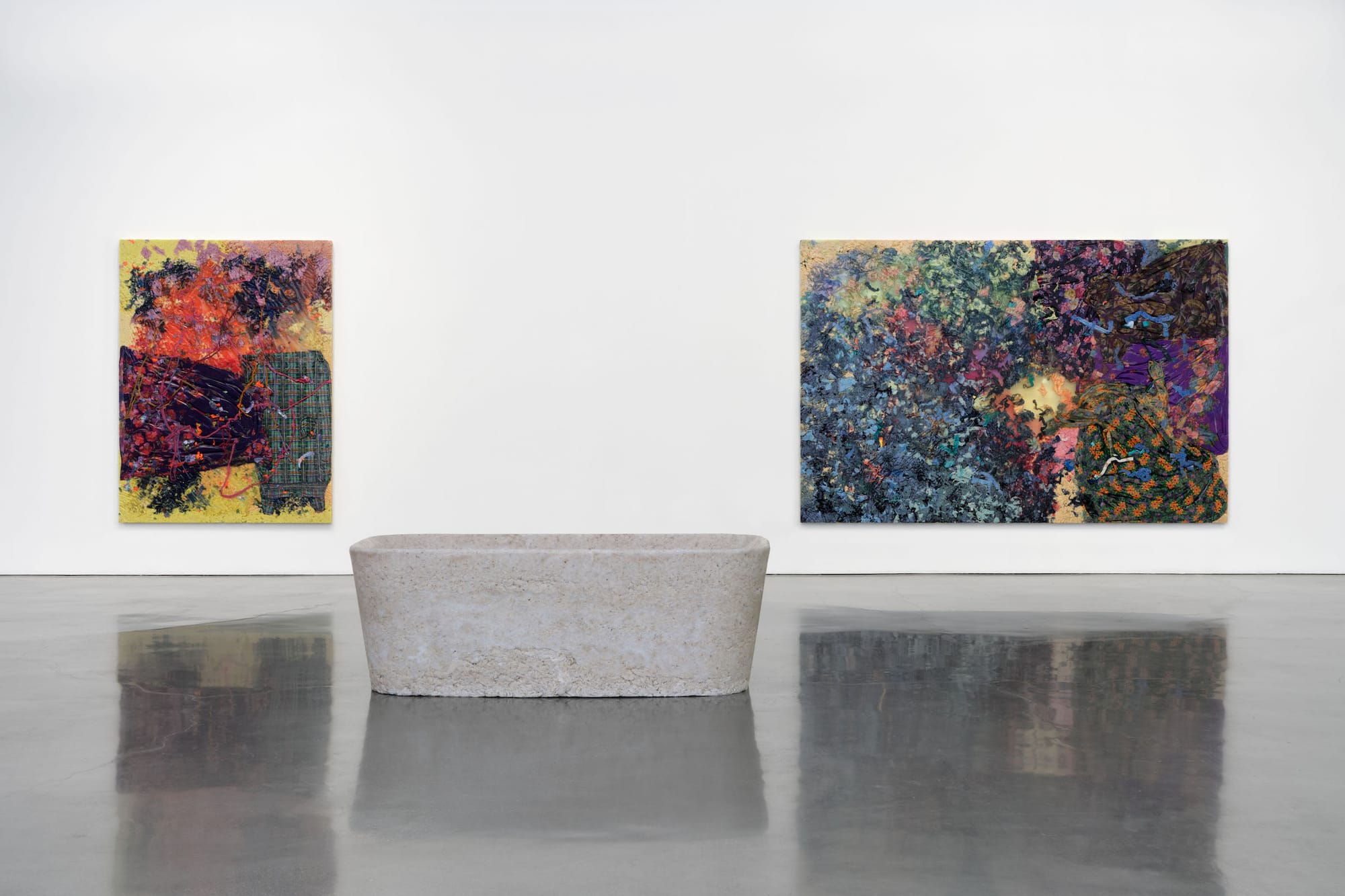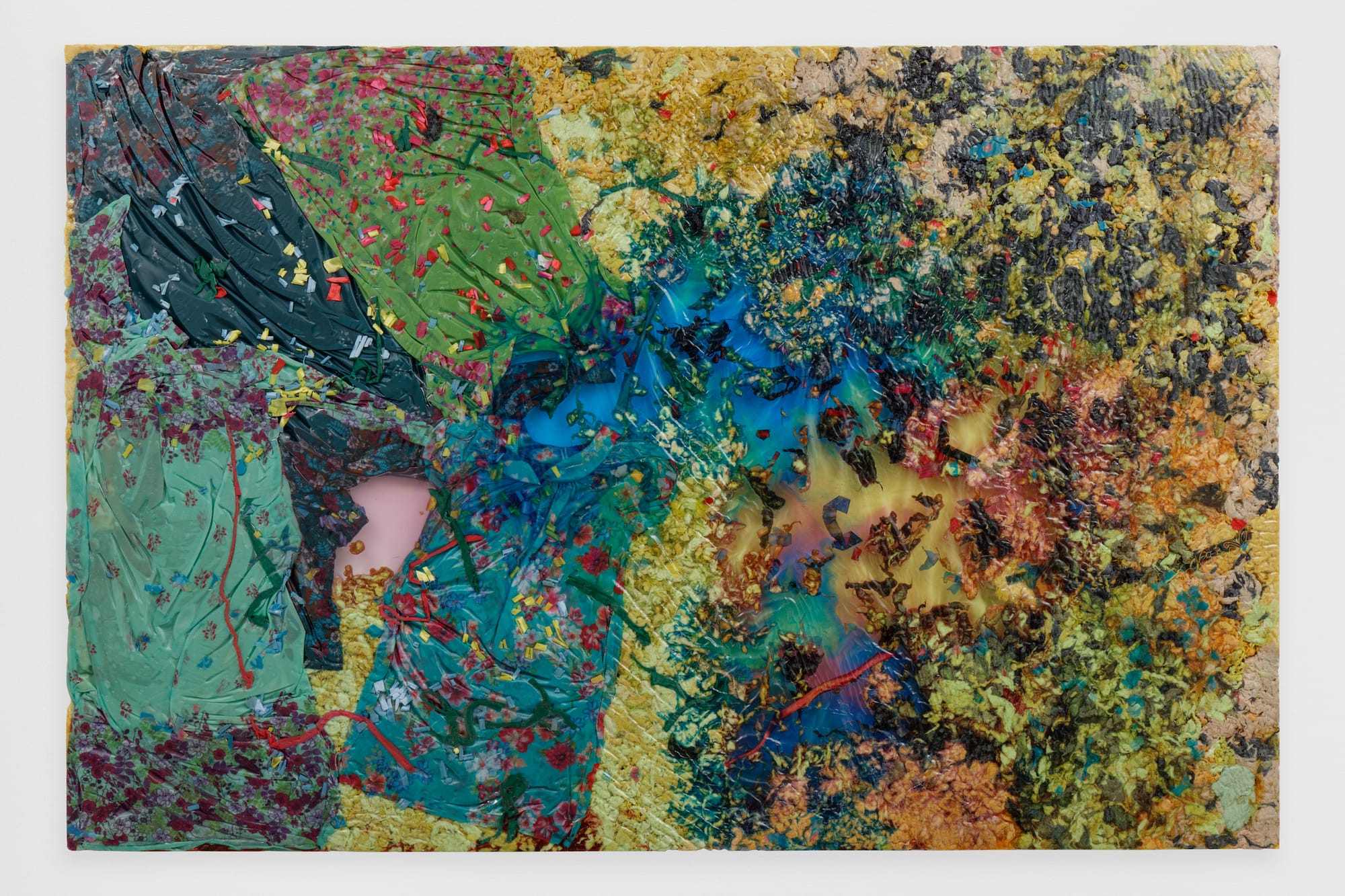 While sound filled the space, so too did material and color in the form of the large works hung on the walls. Beasley calls these slabs, alluding to a long history of friezes that are a hybrid of two and three dimensions. They are made from cotton, house dresses, t-shirts, and du-rags, bound together by resin. Some are compositions that, from far away, resemble the abstract impressionism of Joan Mitchell or Norman Lewis. Images like “Site IV”(2022) are explosions of clementine and violet, while “Crucible”(2022) hints at a subtle horizon, suggesting a nocturnal landscape.