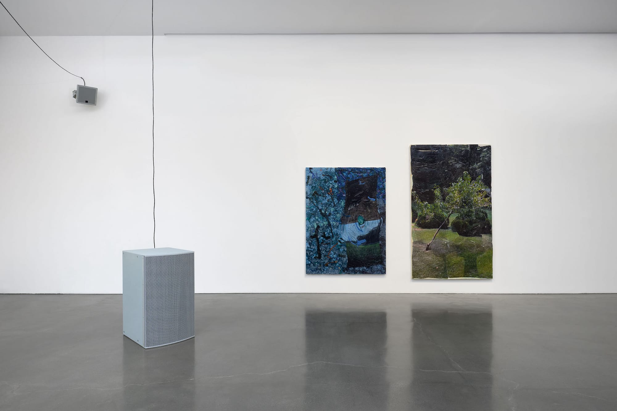 LOS ANGELES — The first thing I encountered in Kevin Beasley’s exhibition On Site at Regen Projects was a wall of ambient sound. I saw a speaker hanging high on a wall, which was connected by a long black cord. I followed it into the second room, which had more speakers and more cords, before it led me to the third and final room where I found a utility pole around which all the cords gathered, reaching from floor to ceiling. This pole, “THE SOURCE” (2022), is the center for the sound as well as the power for the lights that emanate from it. I had followed a network that bound together an exhibition of objects.