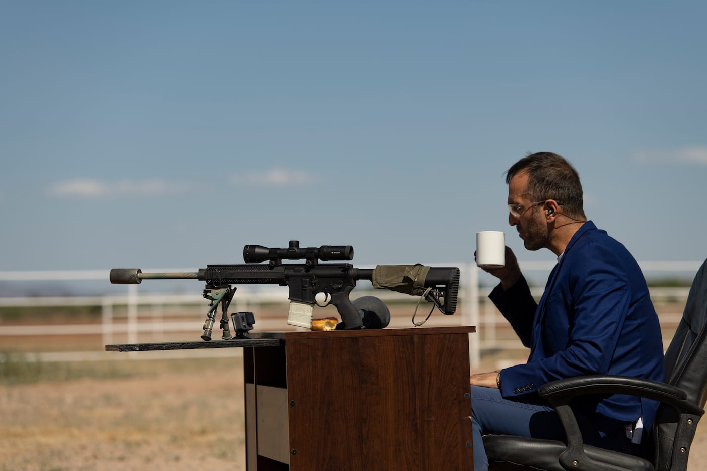 The atmosphere on arrival, at what turned out to be a remote ranch in the desert, was solemn, and somewhat surreal. The scene: an old office chair and desk, over which Jarrar had placed an American coffee cup, donut, and AR15. In the distance two large canvases held in place by temporary beams and stacks of hay were placed at the last minute, as it turned out to be an exceptionally windy day. In between them stood a makeshift beam from which the vials of paint were going to be shot, and behind the canvases large sacks of sand would catch the bullets. We were given earplugs. I felt like I was on a movie set, the movie a cross between the video for David Bowie’s “Ashes to Ashes,” Men at Work’s “Down Under,” and scenes from Pulp Fiction and the original Twin Peaks.
