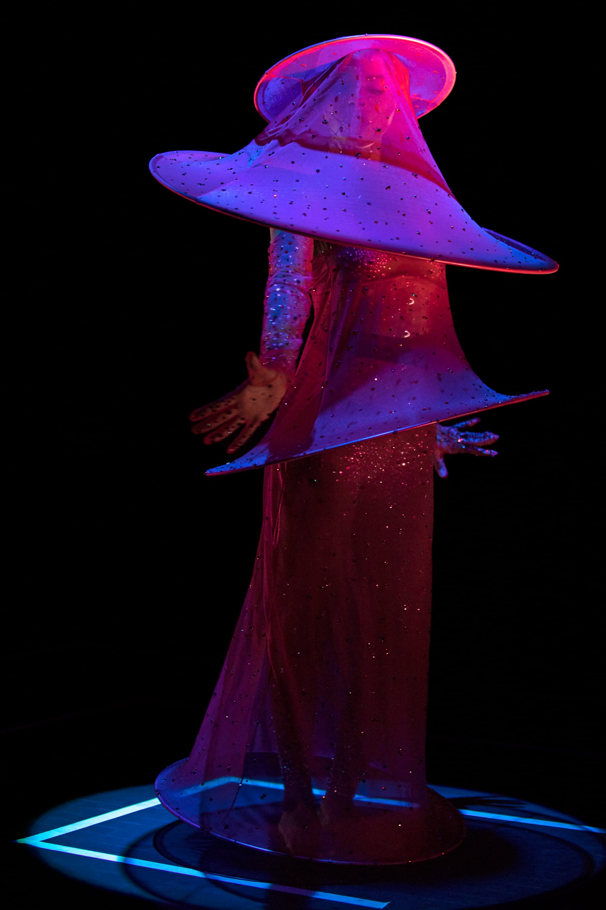 In the first sequence, LaBeija undulates, stretches, and twirls through the path of the spiral cum labyrinth, masked from head to toe in crystal-laden, pink nylon stretched over tiers of cone-like structures. Her solo act was followed by a duet of dancers dressed in fitted black costumes with amphibian-esque adornments made of mirrors protruding from their arms (like fins) and heads (like scales). They engage in an embattled mirroring under a red spotlight, each following the other as they shift through powerful stances, losing track of where one’s movement begins and the other ends.