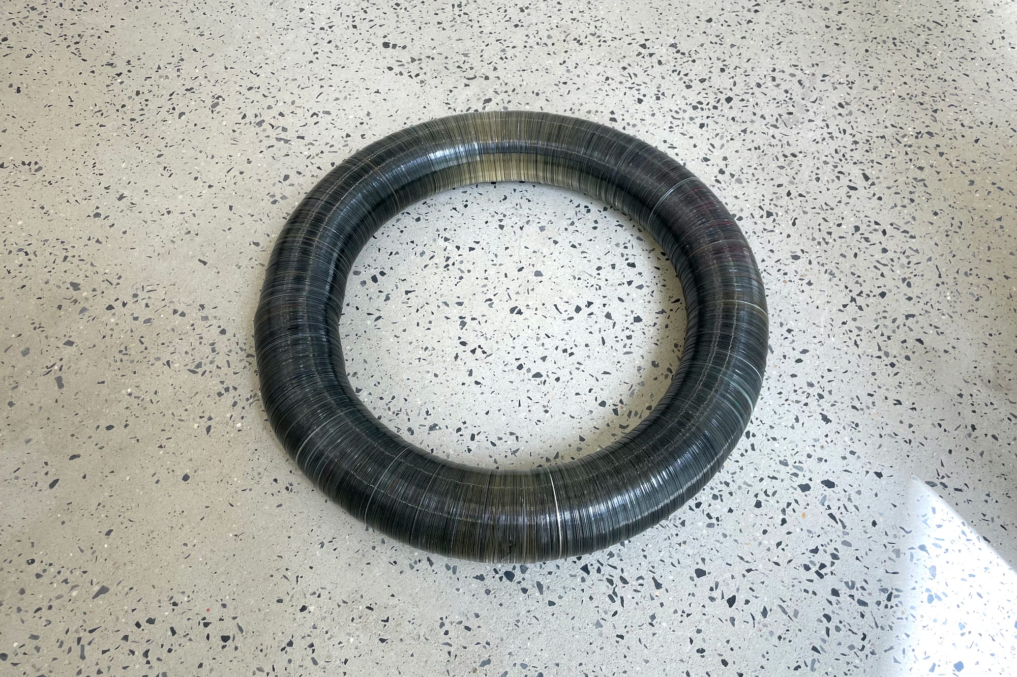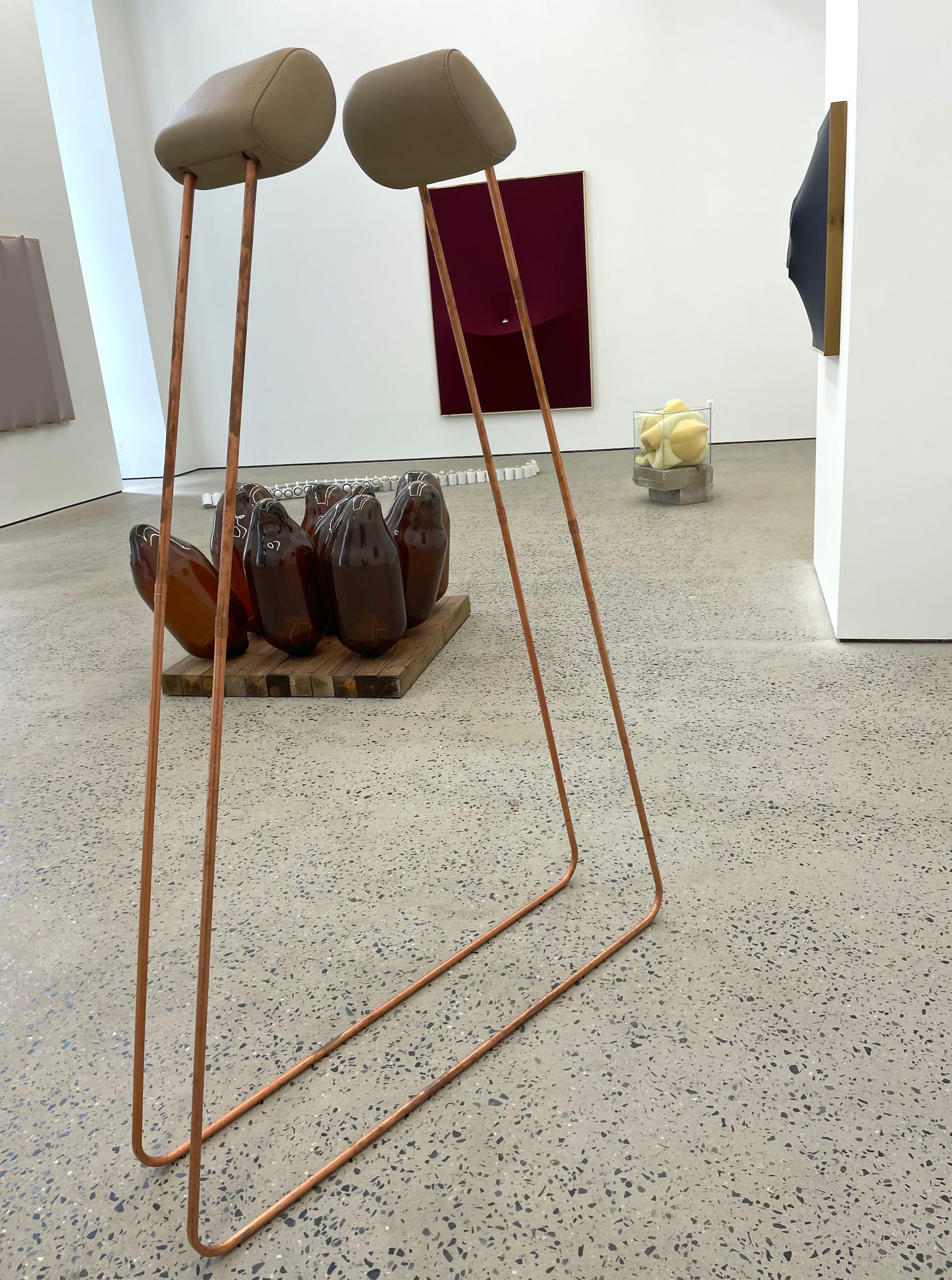 Celeste’s ability to create holistic sculptural forms from disparate and disused parts is a feat in itself; even the most skilled post-minimalist sculptors have a hard time making CDs and DVDs transcend their cheap, mass-produced materiality, as she does with the circular, luminescent “Ouroboros” (2025). More significantly, though, this exhibition emphasizes how deeply the artist’s mostly synthetic composites dig into the organic, living body and its mortality. Yes, histories of human use are embedded in some of her materials — for instance, the car headrests in “Head Rest” (2025), an anthropomorphic form that is at once comical and elegiac. But her gorgeous, tactile sculptures also evoke skins and bones and pressure points, so that they’re not just symbolic of human lives, but reflections of embodiment in all of its fragility and resilience.