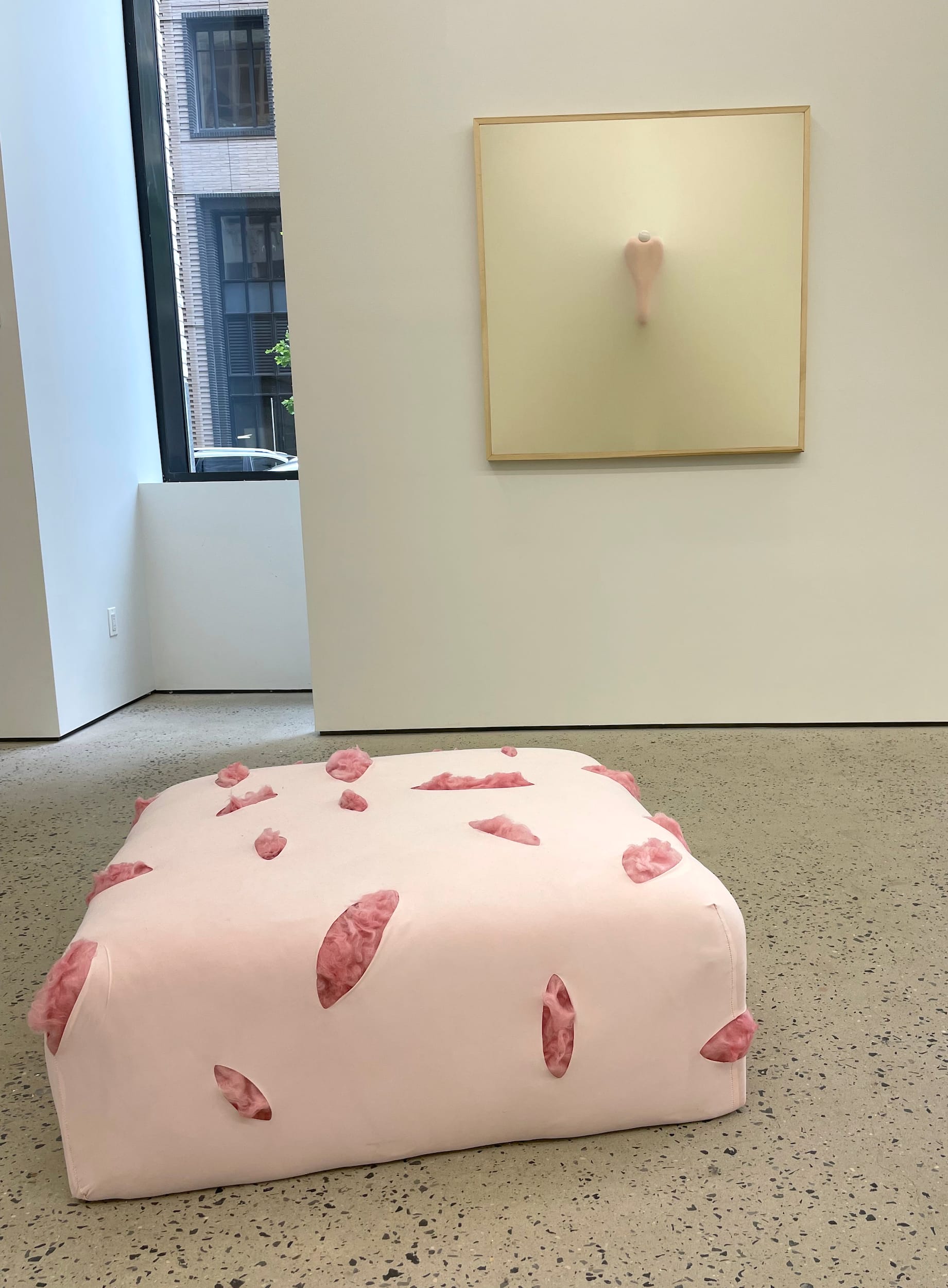 In “Antebellum Pink” (2024), possibly my favorite work in the show, pink fiberglass insulation peeks through slashes in paler pink fabric stretched around a low, rounded rectangular form. The violence of its allusions to cut skin is countered by the insulation's cotton candy color and fluff. While this ambivalence keeps Celeste’s art from stagnating, it’s the imperfections and scars that keep it alive.