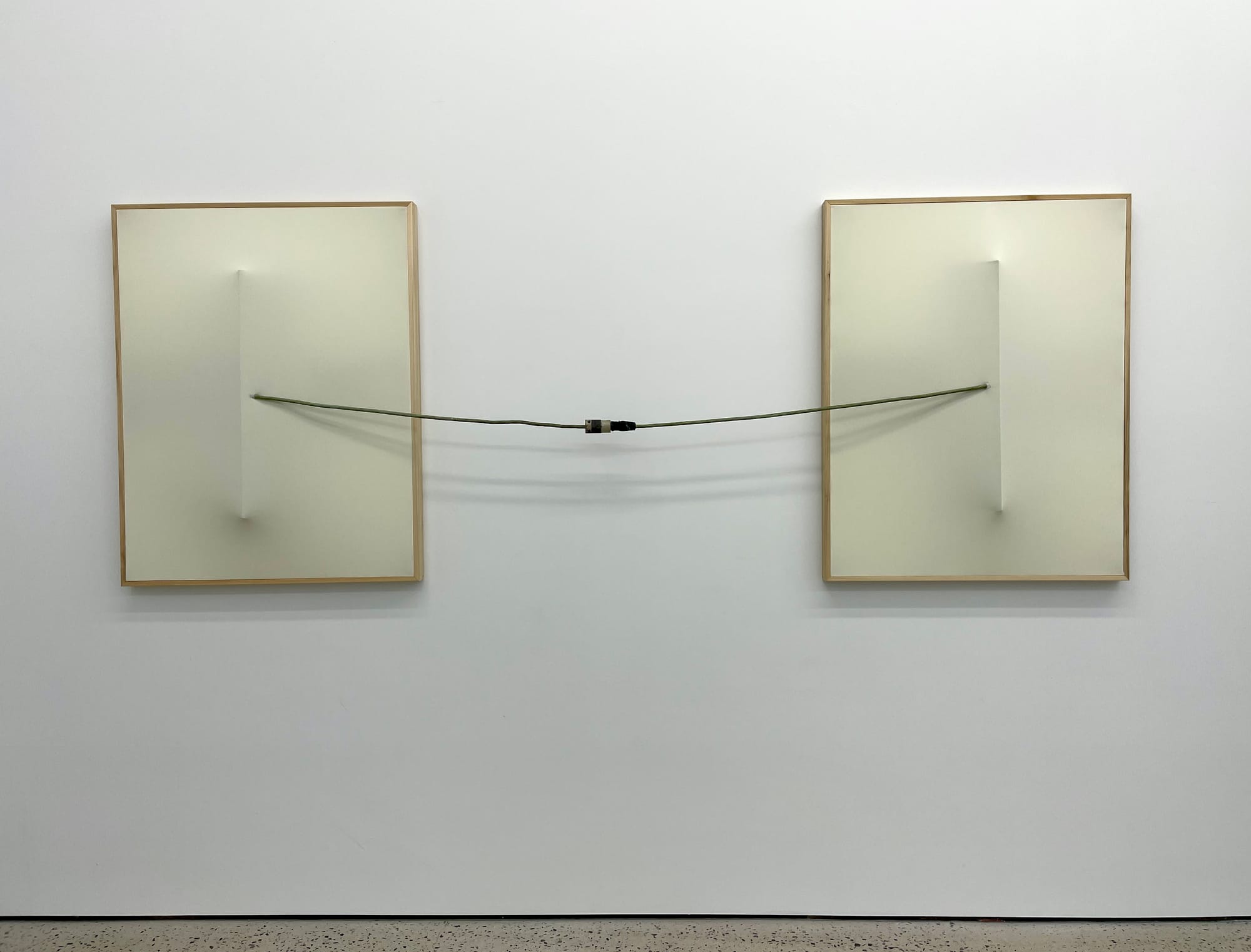For her second show at Swivel, Celeste introduces framed wall reliefs to her repertoire of abstract sculptures. In “Standing Sideways” (2025), the navy blue fabric surface is pushed outward from the inside by the soles of geta sandals. The result is an uncanny and even unsettling disruption of a minimalist monochrome.