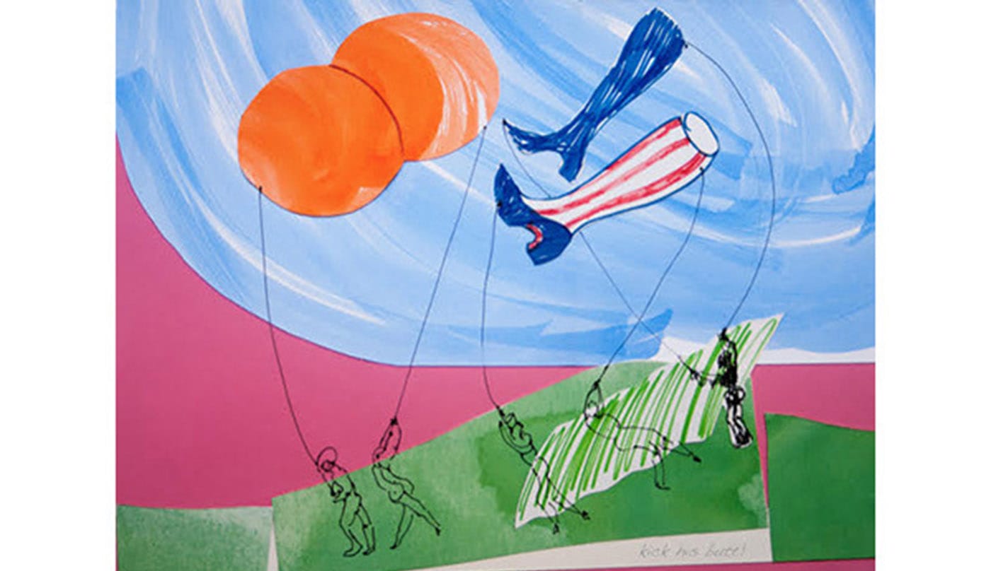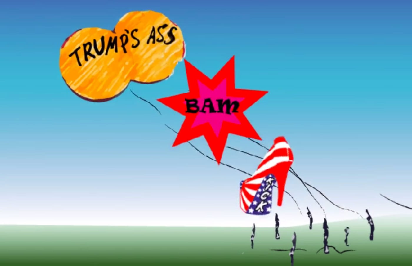 Designed to “express the need to Kick Them Out of Office,” the project is attempting to raise $12,000, with which it proposes to fabricate a giant orange ass and fill it with helium. An instructive video illustrates the process, adding in some stars-and-stripes motif shoes to emphasize the underlying “Kick Him Out” message. Donors will receive rewards, including art swag from collective members, including Gayer, Mary Frank, Tom Klem, Nancy Chunn, Nancy Davidson, and Susannah Stern — as well as high-tier rewards including the honor of having your name tattooed on the inflatable butt, or an actual We Make America 4’ papier-mâché (or inflatable) shoe or butt — presumably after they are done marching with it. For the highest donation level of $3,500, WMA will come to you and make a one of a kind artist banquet for you and 8 of your friends, including alcohol.