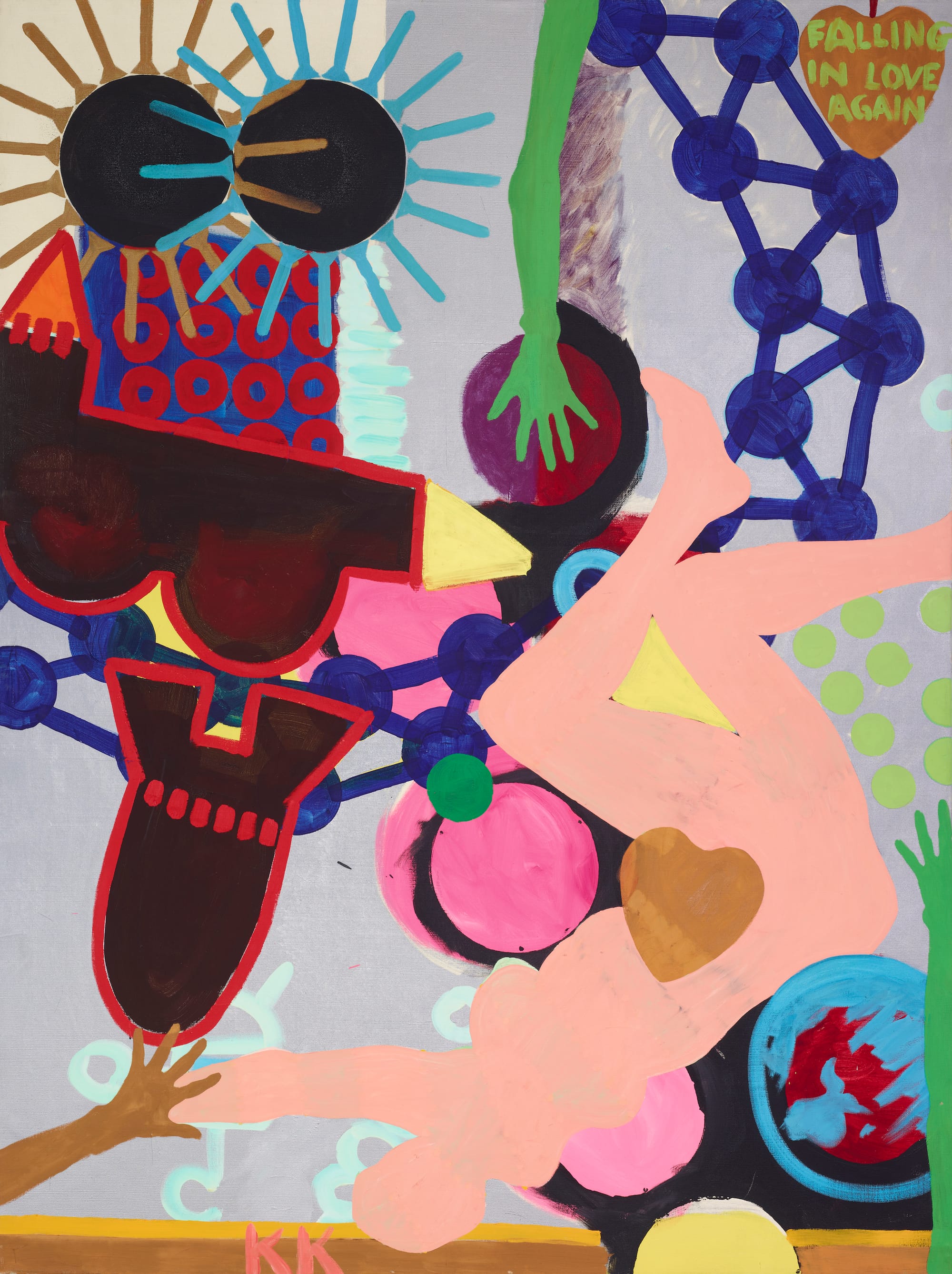 In “Falling in Love Again,” created in 1962 during the Cuban Missile Crisis, Kogelnik linked her personal narrative of love with the geopolitical standoff between the USSR and the USA. Two radiating Sputnik satellites intersect as a rocket detonates below. A woman’s body plunges towards the small orb of blue earth as arms reach to catch her.