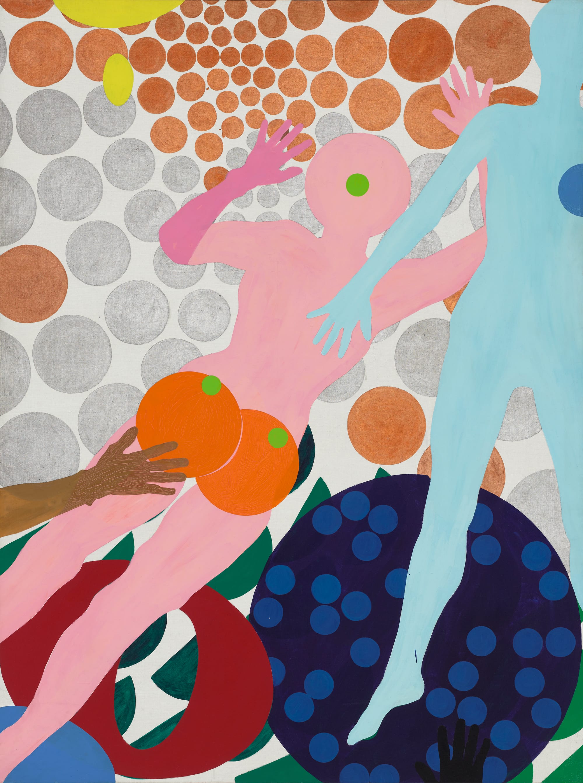 By 1964, Kogelnik had found her independence from abstraction, supplanting gestural style with crisp, graphic forms. She returned to depicting the universe in “Outer Space,” in which two bodies, one pink and one blue, disentangle in a field of shimmering, stenciled dots. (Roy Lichtenstein was a good friend.) The dots expand and contract, creating a suction at the top of the painting. It is territory that is neither East nor West, past nor present, but a cosmic realm. In uncharted space, Kogelnik offers us a vision of bodies released from history and women from the domination of the mundane consumerist trappings that imprison them. For it is the pink, female silhouette that reaches upwards and away, towards the outer limits and untethered freedom.