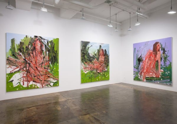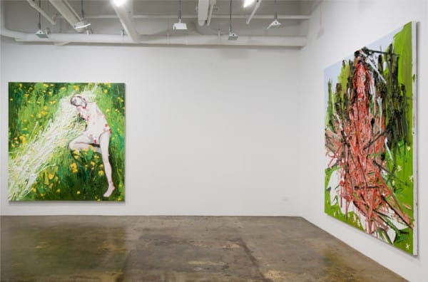 When I was first confronted with Kim Dorland’s solo show For Lori at Mike Weiss Gallery in Chelsea, I was overwhelmed with the aggression of the paintings, the way that every brush stroke or paint smear looked lacerated. Boils of paint, defying gravity by cracking off onto the floor, have the mutilated texture of something that’s been set on fire. The human form is not carefully studied, but attacked out of the paint. I was shocked that works so savage were apparently of someone the artist loved, but as I spent more time with them I realized the passion in this was a lover’s obsession.