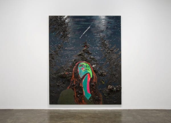 This is the Canadian artist’s second solo show at Mike Weiss Gallery, the first being New Material in 2010. That exhibit was more fixated on phantasmagoria, with skulls and growling animals lurking in dark forests, and a few taxidermy animals splattered in paint. Creeps of that come into For Lori, even beyond its animalistic desire. In the front of the gallery are darker portraits, where suggestions of faces appear like skulls on paper with ripped edges. The dominating work is “Stargazing,” where a neon Lori is looking up to a night sky made of pasted on gems and a childish shooting star trailing glitter.