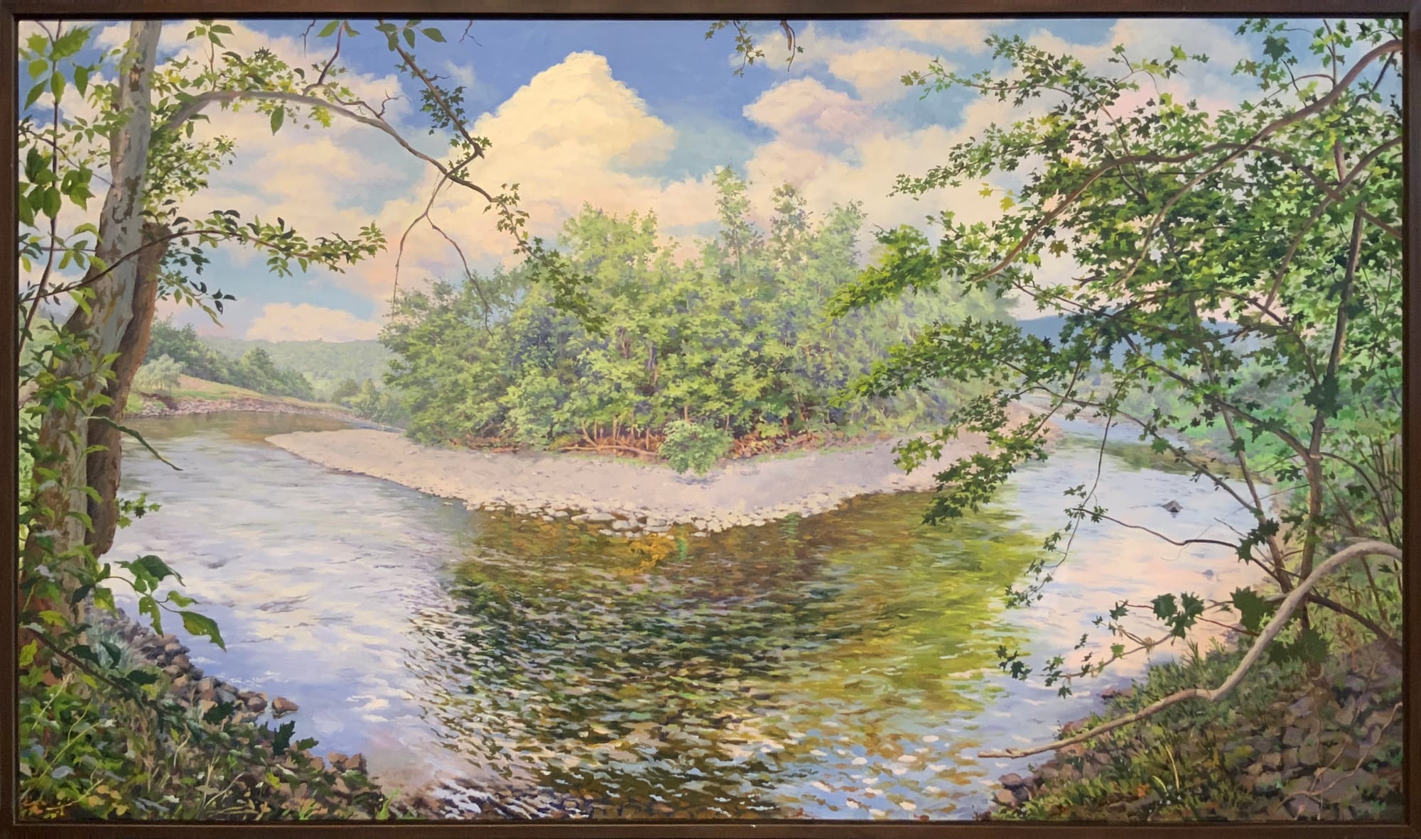 In the symmetrical composition “Looking Through” (oil on canvas, 48 by 84 inches, c. 1998), Do illustrates a radical shift in perspective. As the river bends around the far shore, as if making a U-turn, the change in the color density and reflections in the river, as well as the different trees on the right and left sides, disrupt the mirroring effect.