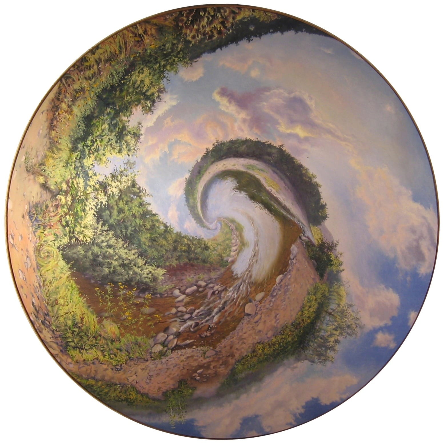 In “Oculus Buteo” (oil on linen, 60 inches in diameter, 1995), the land curls from the top into the painting’s center, like Robert Smithson’s Spiral Jetty (1970), except instead of being surrounded by water, we see land and sky.