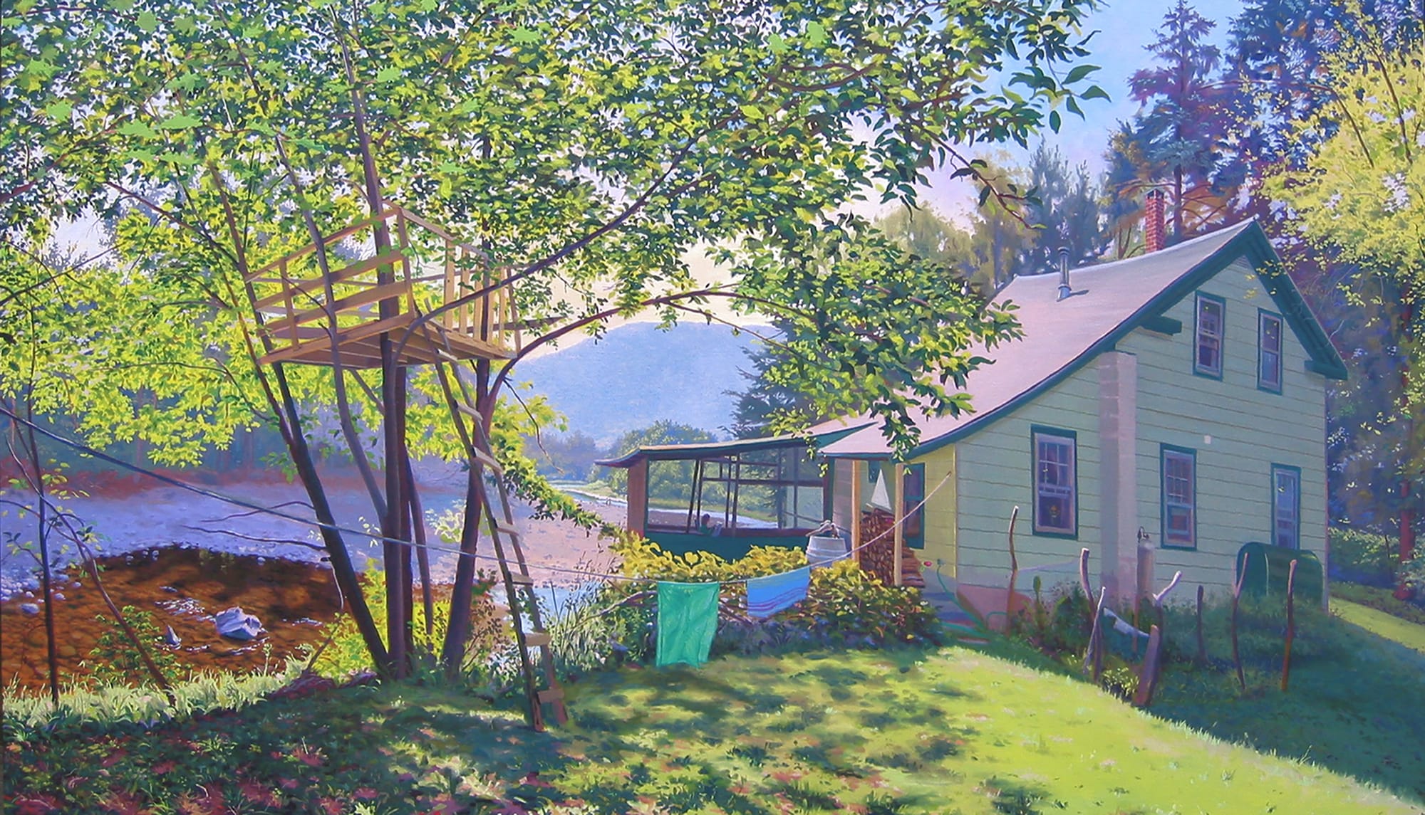 Painted nearly 20 years ago, “Our Backyard” (oil on canvas, 44 by 80 inches, 2001) is one of the exhibition’s highlights. The view is of a farmhouse with a screened-in porch, in which someone is reading, on the right, and a treehouse on the left.