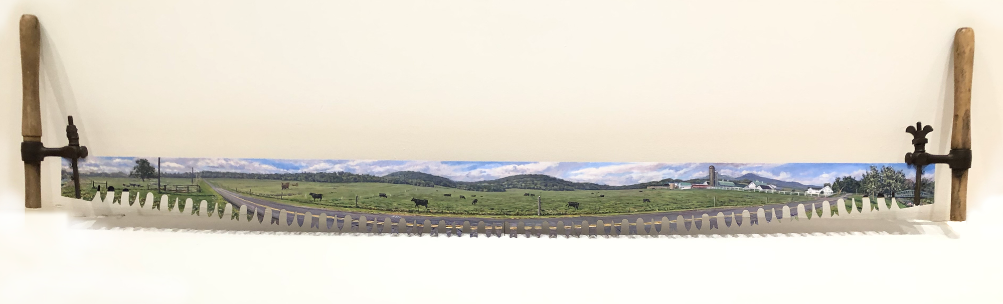In “Two-Person Saw” (oil on steel, 12 by 72 inches, 2014), another loosely symmetrical composition, Do uses the narrow format to depict a highway stretching from the left to run along the bottom, above the saw-tooth blade, and then curve away, receding into the distance on the right. On the other side of the road, there is a field with grazing cows, a farm and silo on the right, and rolling hills in the center. Painting on handsaws — a tool for making — he has constructed his own inimitable world.