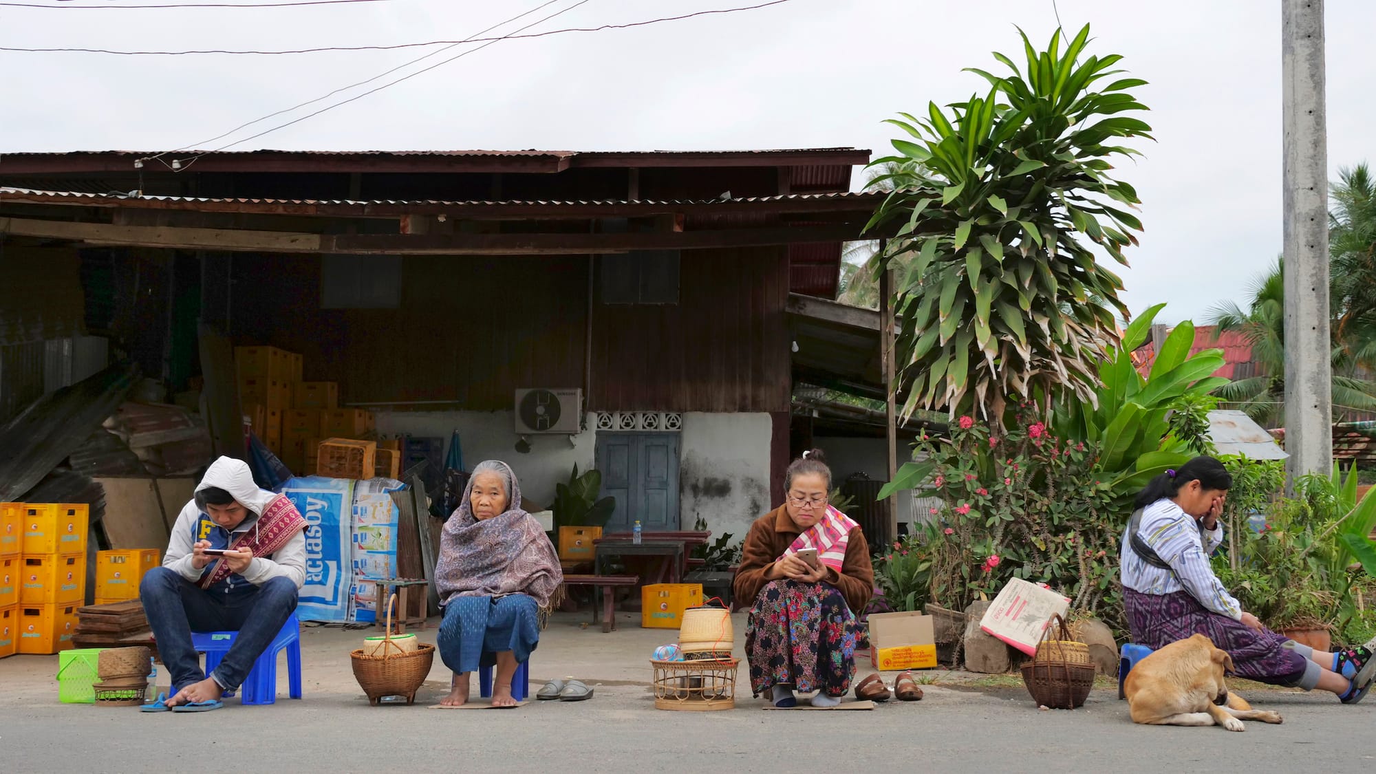 Morning birds sing, a rooster crows, a hammer beats steady. Four figures line the side of the road, each sitting beside a basket of rice. Some gaze down at their phones, one at her empty-skirted lap. Two are barefoot, while a woman in socks and sandals stares silently ahead in profile. A collarless dog stretches before her, nursing his paw as a moped speeds by.