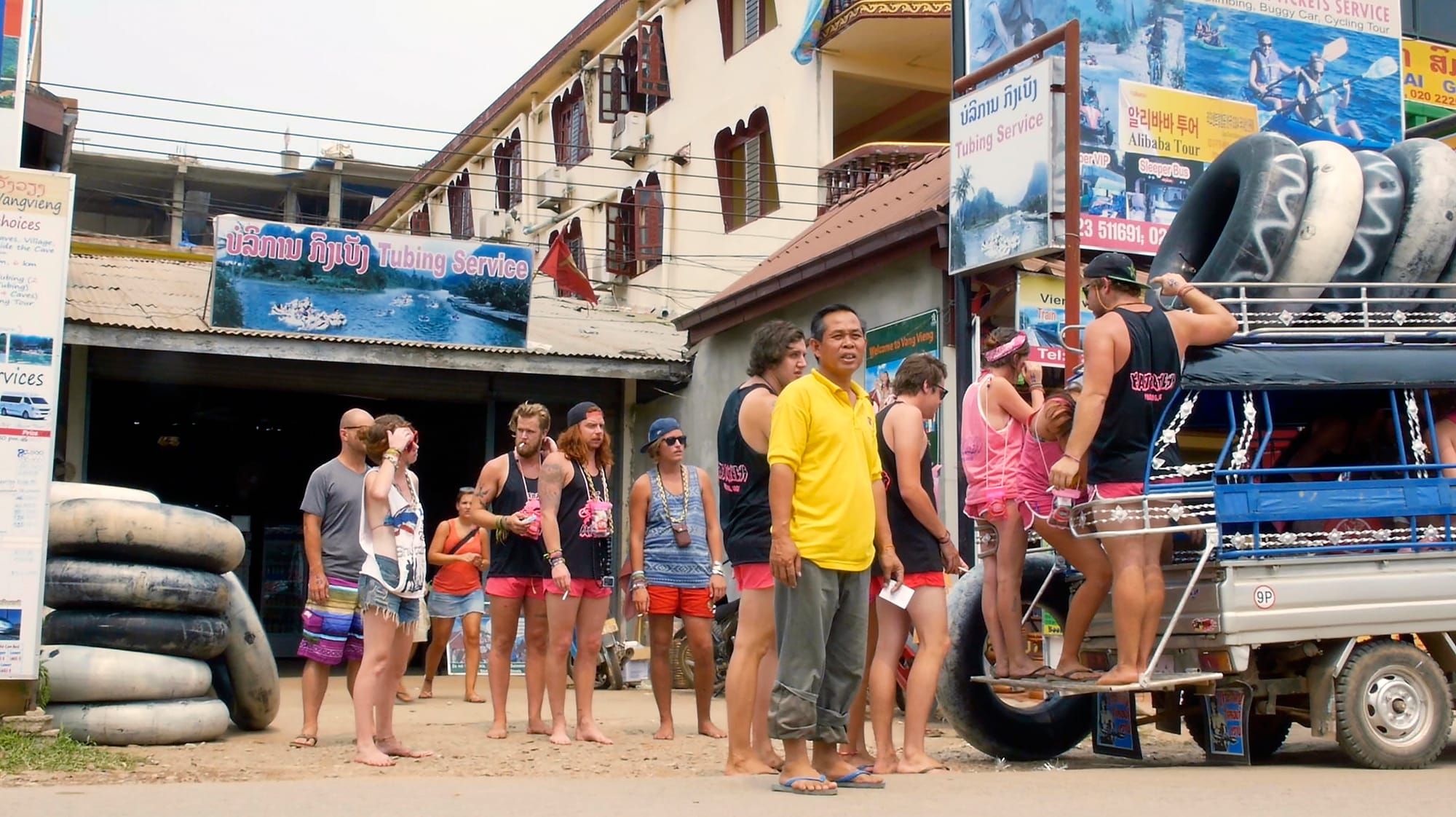 Relying on a stationary camera for shots ranging from 30 seconds to over five minutes, the film moves from space to space in an unnamed Southeast Asian country, seldom revisiting any setting or individual. Not knowing when a scene will end, we are compelled to both anticipate what might come next and to slowly absorb what’s unfolding onscreen. Many shots reveal the subtle tensions between tourists and the residents of, as the end credits reveal, what we eventually learn is Laos. Flip-flopping onto historic sites with cameras and bags flapping against their ribs, these foreigners feel all too familiar. It’s easy to cringe at the sunburned lads in backward caps, college girls splashing in tankinis, and giggling middle-aged women striking a pose. What they all share in common are the money and time to squander abroad while ogling “exotic” terrain and people.