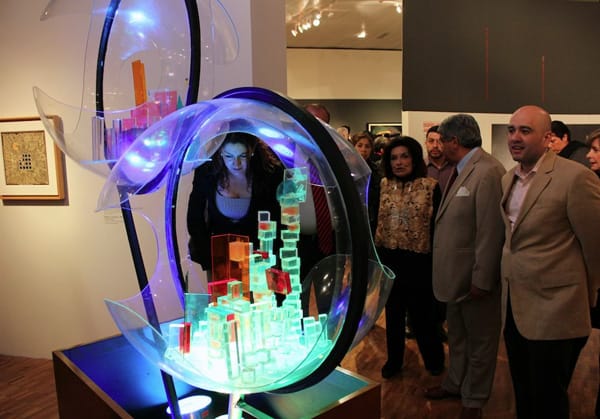 By including examples that range from Op art and illusionism to surrealism in the work of Xavier Esqueda to optical Cubism by renowned artist Pedro Friedeberg, whose acrylic and ink work “1970 Maimonides Dream Laboratory” is mesmerizing, these works serve to preempt and contextualize the purely Kinetic-based artworks. At the epicenter of Kinetic practice is Lorraine Pinto’s “Quinta, 1968” (Dimension, 1968) that here takes center stage, with two alien-looking globes that refract blue light off stacked acrylic building blocks housed within each cylindrical part. Usabiaga contextualizes this Kinetic work by comparing and contrasting it to other art styles of the time, and in so doing create s a fuller understanding of the social and cultural situation of the works — and for a visitor such as myself this proves invaluable.