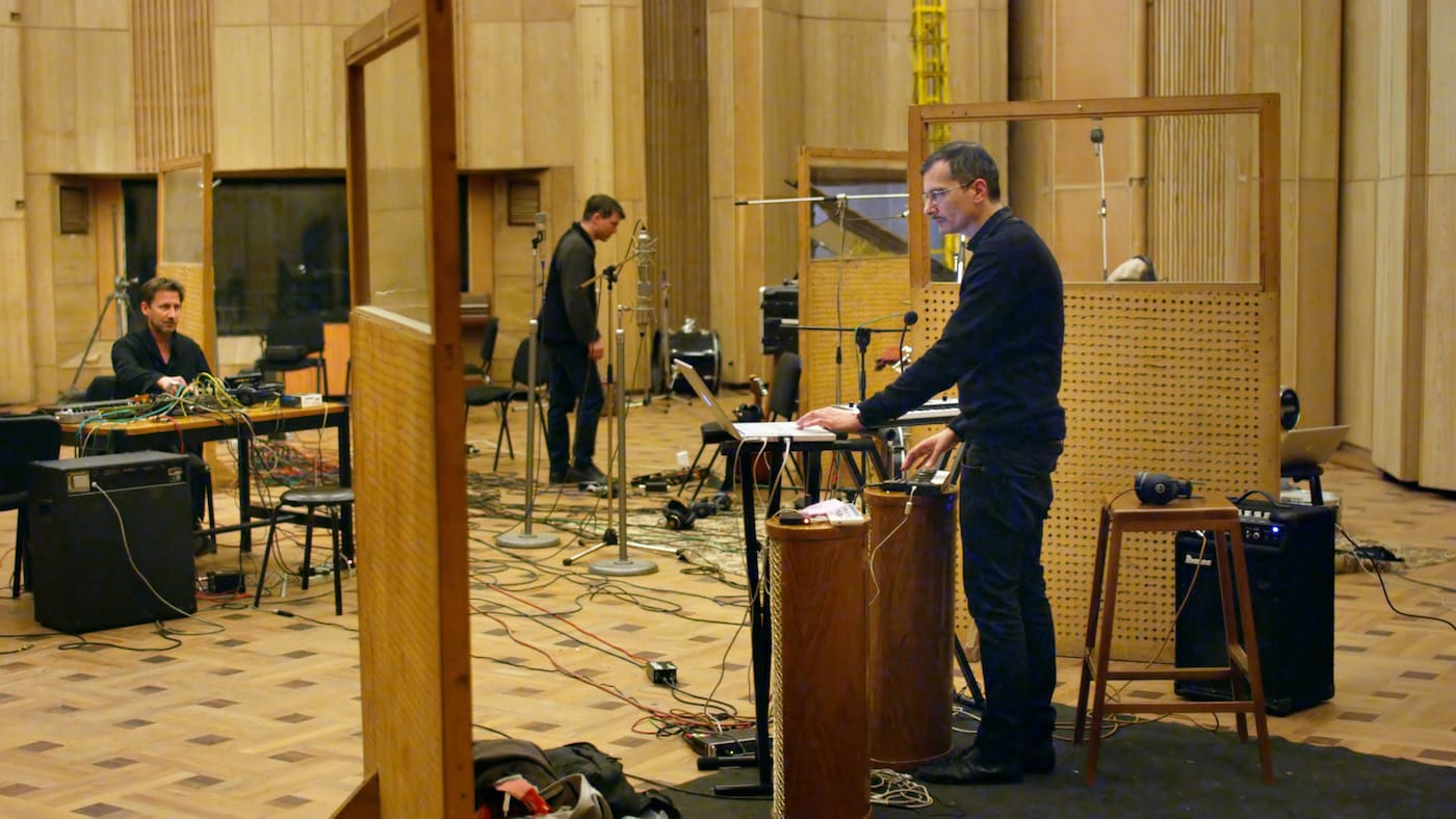 This isn’t the first time Emigholz has worked with Kreidler. The filmmaker has shot a few of their music videos, including “Deadwringer” (2012), “Sun” (2012), and “Winter” (2013), and songs from the album Den (2012) can be heard on the soundtrack for Emigholz’s The Airstrip (2014). In many ways, Kreidler and Emigholz were made for each other: Both are minimalists in their own ways. Both use repetition and distill their medium-specific aesthetics to the fundamentals: composing, shooting, and editing shots for Emigholz’s films, and simple yet layered beats for Kreidler’s instrumental tracks. Where Godard’s camera roamed throughout the studio in One Plus One, Emigholz’s remains firmly planted while Thomas Klein, Alexander Paulick, Andreas Reihse, and Detlef Weinrich play drums, bass guitar, and keyboard, and manipulate the electronics.