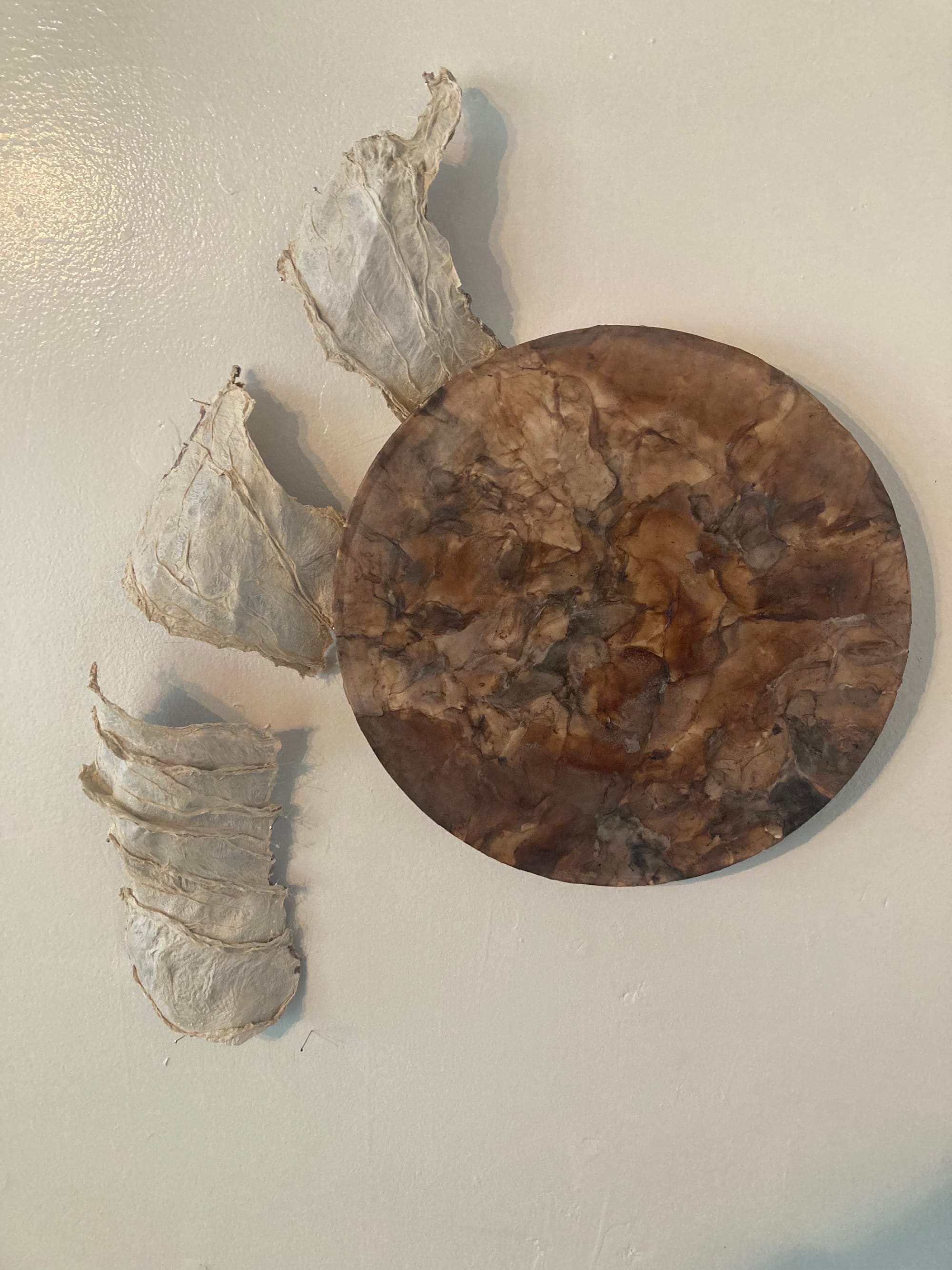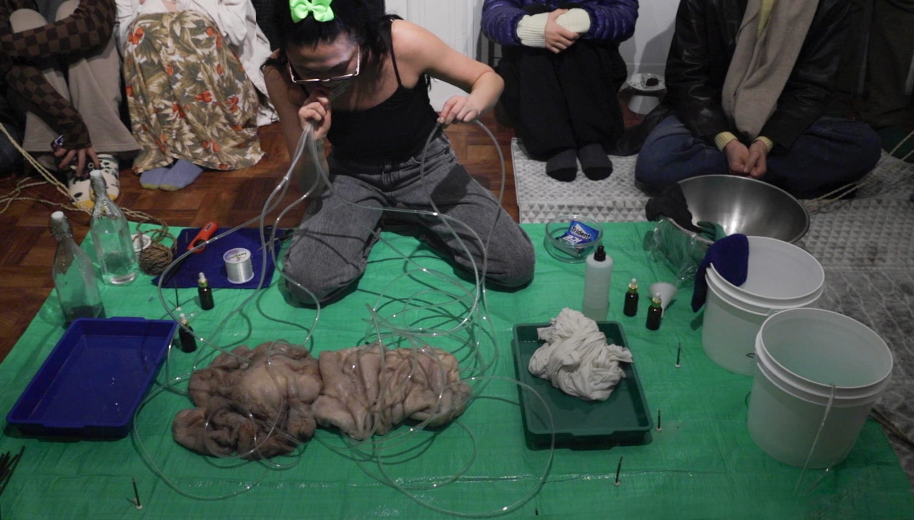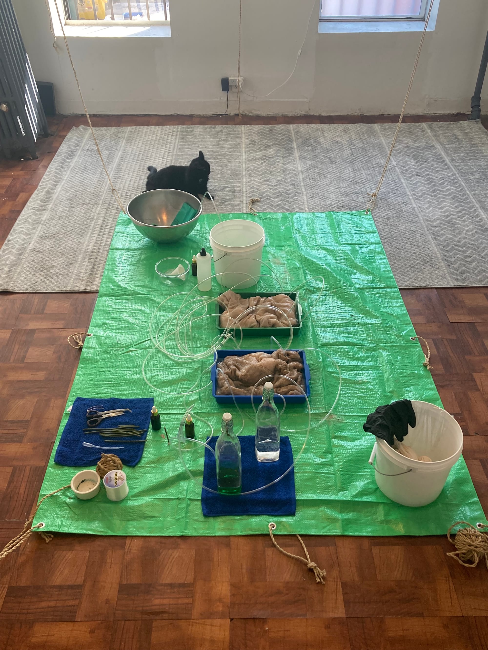 "Whip and Tongue" (2024), installed at the center of the one-room show, consists of a large green tarp with two bins of glistening, fleshy kombucha connected by a network of clear tubes. Bottles, gloves, scissors, buckets, and burning incense also populate the tarp. Taken together, the work looks like part science experiment and part spiritual ceremony. Orbiting the bizarre configuration are various sculptures of dried-out kombucha with a similar texture and color to the vellum on the wall. These thin skins are contorted, crinkled, misshapen, and carefully sewn together using clear nylon thread. "Untitled" (2023), propped upon the mantle of a fireplace, is particularly skin-crawling, yet eerily beautiful: Bits of dry kombucha that recall glass are delicately grafted in the shape of a dismembered leg.