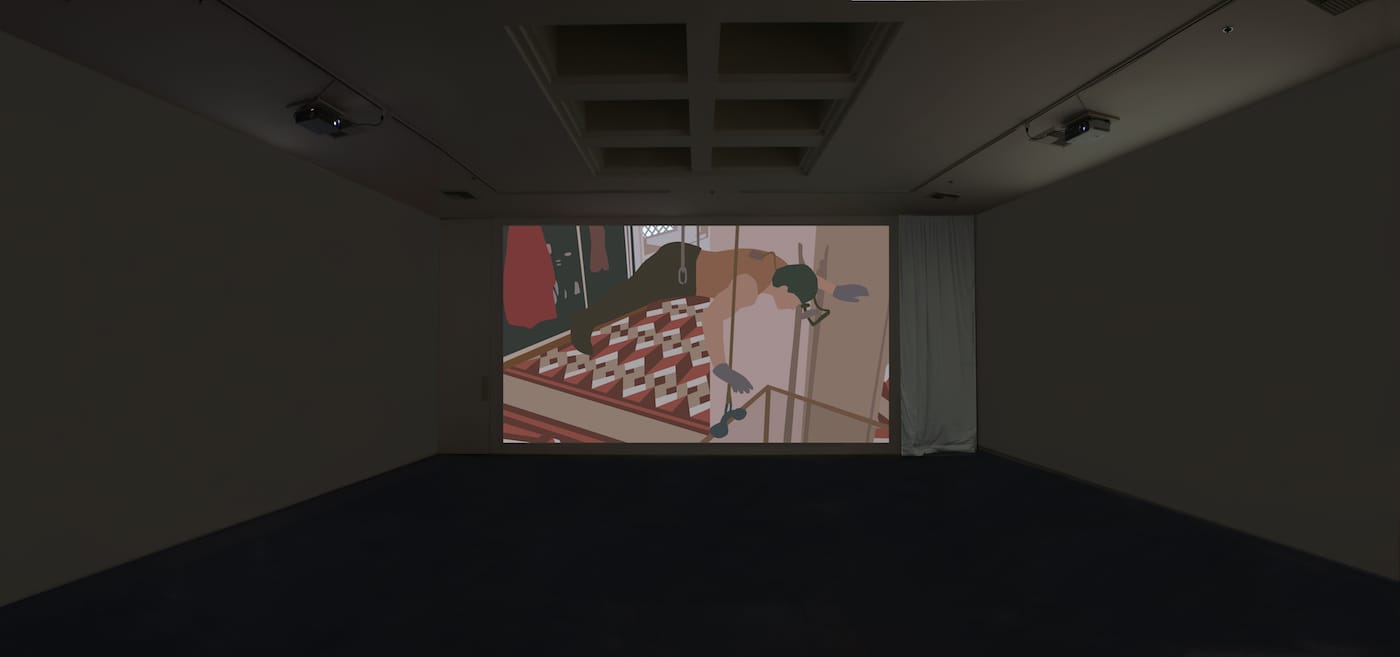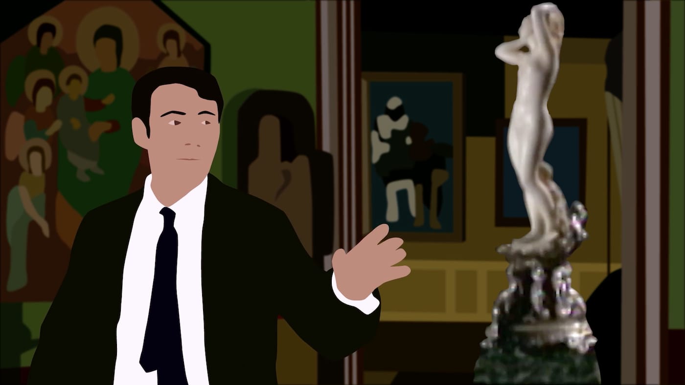 In his exhibition The Crime of Art (Hollywood Edition) at Christopher Grimes Gallery, Ezawa appropriates art heist scenes from famous Hollywood films: the theft of a Monet painting in The Thomas Crown Affair (1999), a Rembrandt in Entrapment (1999), a Cellini in How to Steal a Million (1966), and an emerald encrusted dagger in Topkapi (1964). Using his iconic cartoon-like style, he recreates the crime scenes in video animations but leaves the original artworks as they appear in the original movies, rather than using rotoscoping. In this unexpected reversal of fiction and reality, the artworks stand out as real but everything else in the video is repackaged as a fiction.