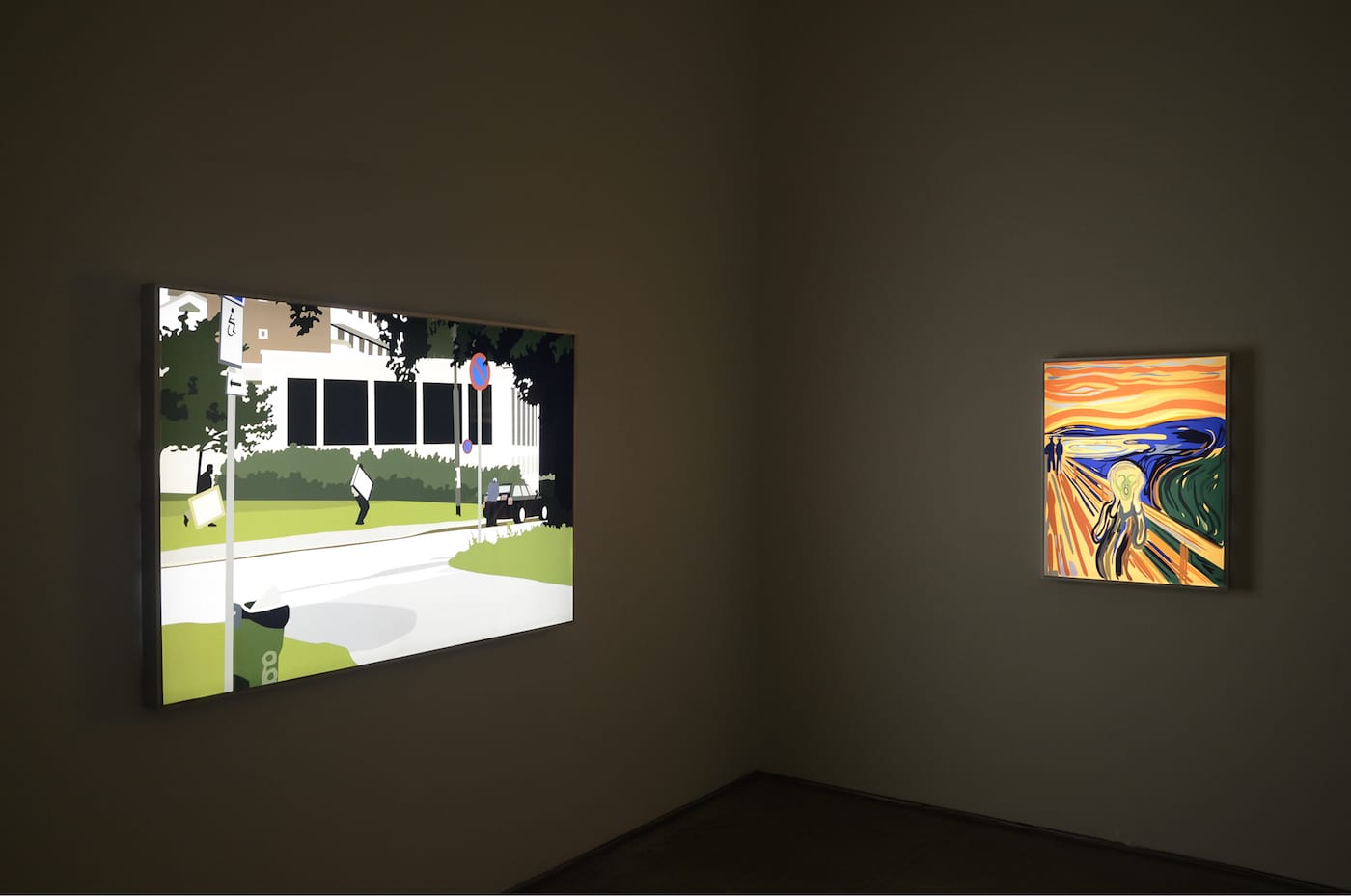 In a small back room, behind a curtain, are two light boxes. For these, Ezawa recreated Edvard Munch’s “The Scream” to scale, versions of which were stolen in 1994 and 2004, and Gustav Klimt’s “Portrait of Adele Bloch-Bauer I,” which was appropriated by the Nazi regime in 1938 and later repatriated to the Bloch-Bauer family in 2006. These light boxes are lit from behind by LEDs, illuminating the ways in which famous art can be reduced to kitsch in consumer culture; they recall the poorly copied images sold as souvenirs.