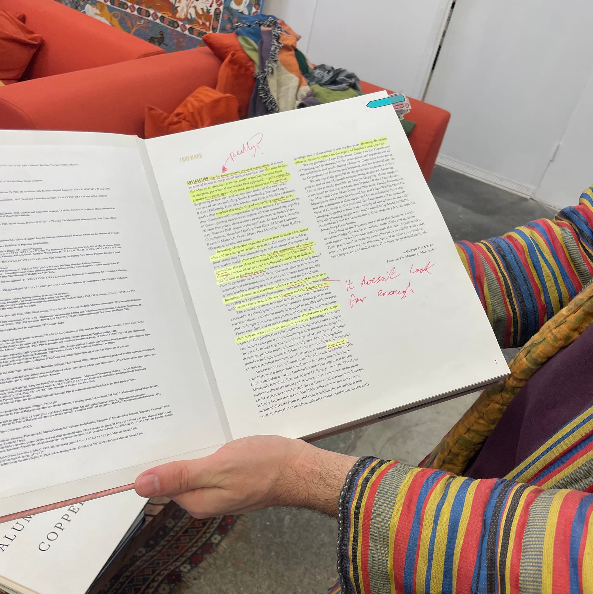 Kour Pour in his studio with the original annotated “Re-Inventing Abstraction 1910-1925” (photo Tina Barouti/Hyperallergic)