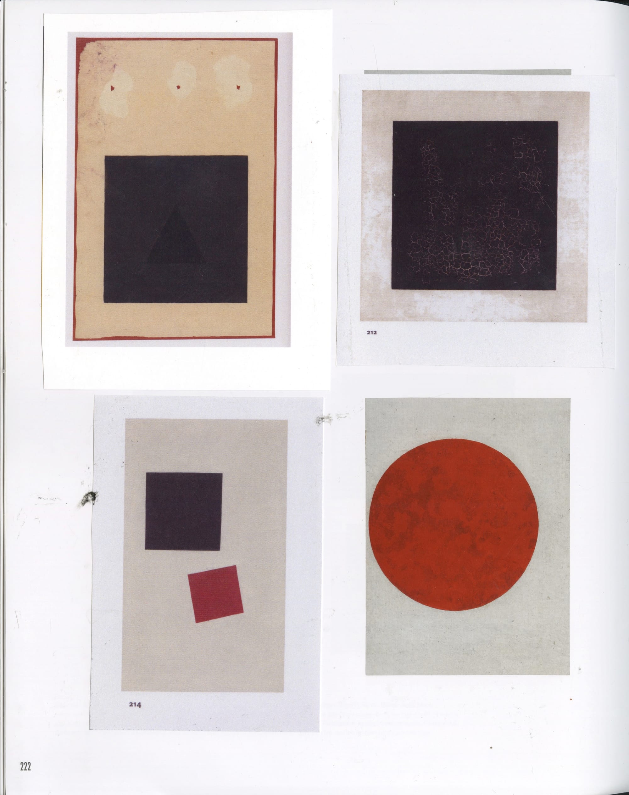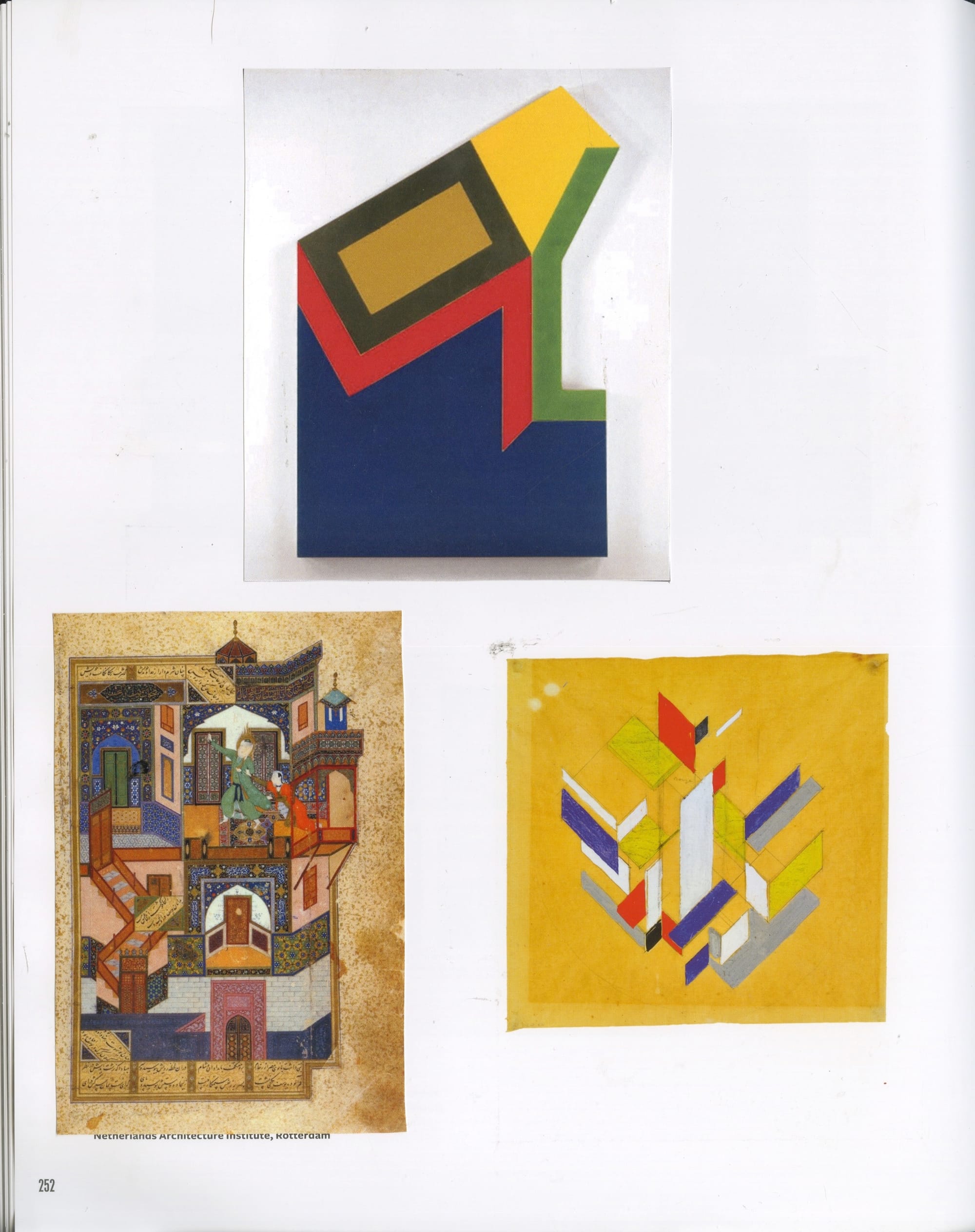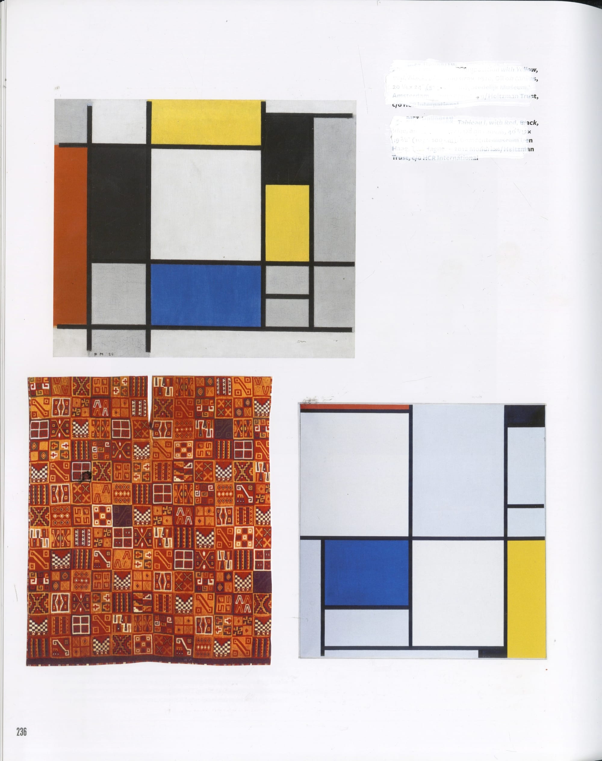In addition to his frustrated critiques in the Inventing Abstraction catalog’s margins, Pour cut-and-pasted reproductions of artworks from Western art history’s periphery, such as Persian manuscripts and Islamic tilework, directly onto the bookplates. On one page, he paired Tantric Hindu paintings, the earliest of which date back to the 5th and 6th centuries, with Kazimir Malevich’s “Black Square” (1915). The two are nearly indistinguishable. On another, Inca textiles are paired with Piet Mondrian’s De Stijl compositions, and Persian manuscripts are placed together with irregular polygon paintings by a giant of American modernism: Frank Stella.