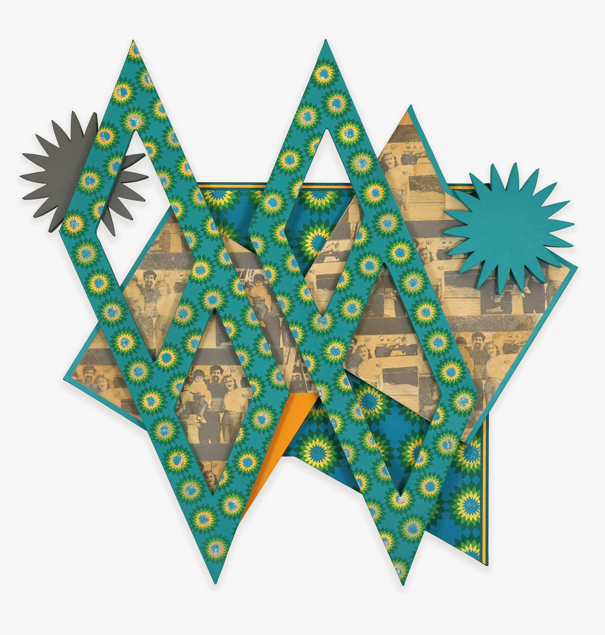 By conversing with the work of Stella and other figures in the canon of modern art history, Pour’s shaped canvases disrupt it. He also sprinkles biographical elements into the paintings to reflect his British and Iranian background, while slyly referencing the United Kingdom and the United States’s political meddling in West Asia and North Africa.