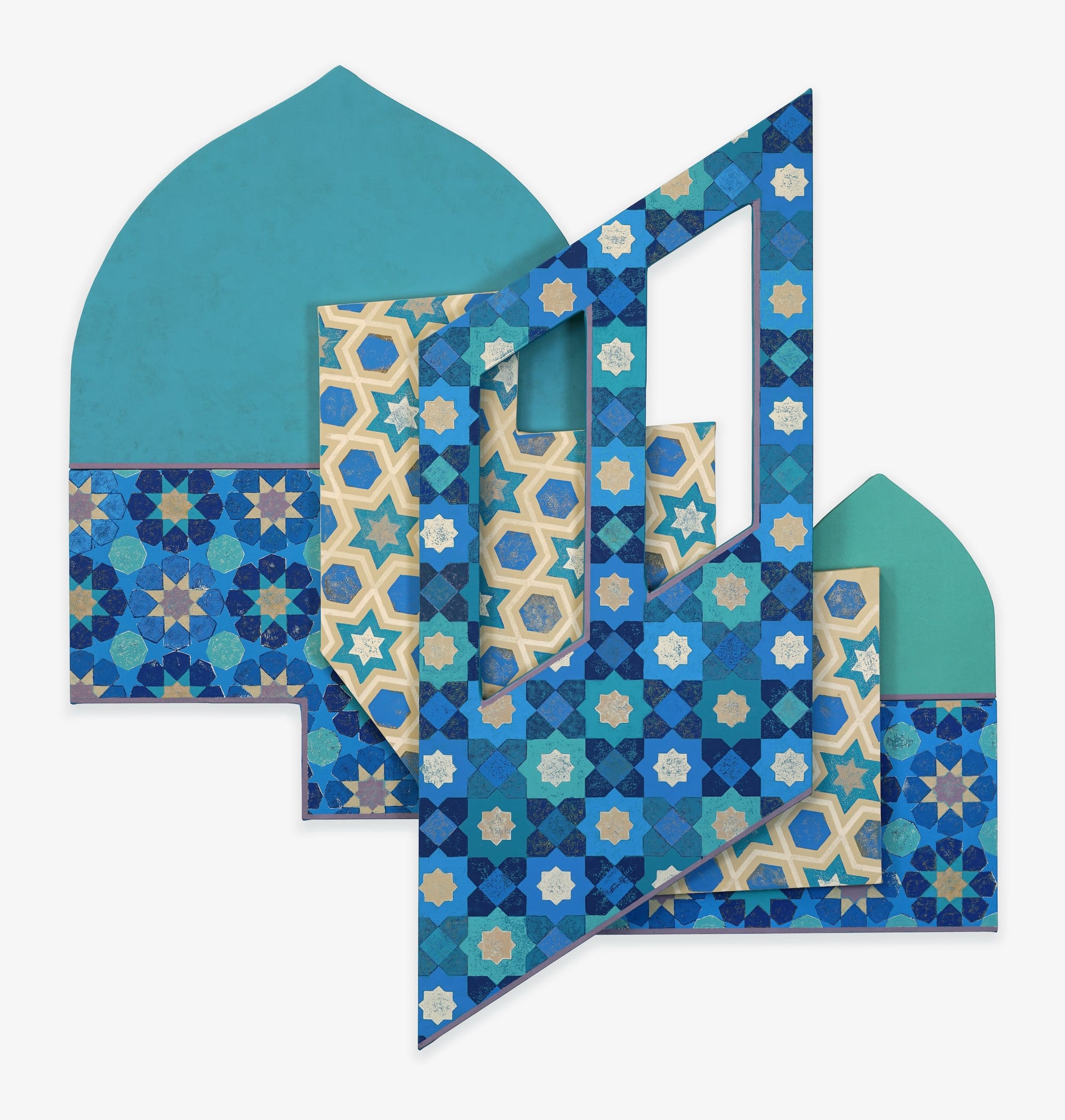 Kour Pour, "Twice Removed" (2025), acrylic, block ink, and esphand on shaped canvases (all images courtesy Kour Pour Studio, unless otherwise noted)