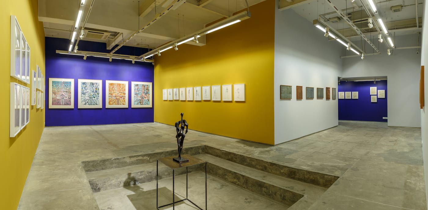 Seen together, these elements frame Reddy’s singular approach to form-making through a fluid exchange between printmaking, drawing and sculpture. With walls painted in shades of cobalt blue and mustard yellow, the exhibition cleverly uses the gallery’s L-shaped footprint to create spatial separations between distinct bodies of work. The selection is eclectic, but it works.