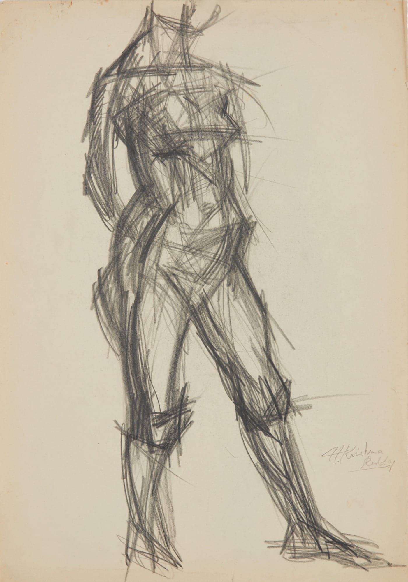 Though rare, there have been exhibitions in New York and India over the last 40 years that have offered a critical lens through which to appraise Reddy’s influence and legacy, including a solo retrospective at the Bronx Museum of Art in 1981 that traveled to museums in Mumbai, Bhopal, and Kolkata. Three exhibitions at the Rubin Museum in New York in 2011 showcasing Modernist art from India included Reddy’s figurative drawings of Buddhist sculptures at the Ajanta Caves (1940), revealing the Indian sources of his art. And in 2016, the Metropolitan Museum of Art mounted the exhibition Workshop and Legacy: Stanley William Hayter, Krishna Reddy, Zarina Hashmi.