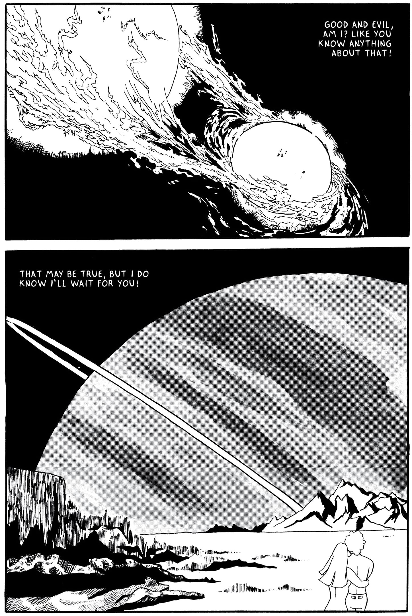 The lengthy contextual essay at the end of the collection (the book reads back to front, right to left, in traditional Japanese fashion) draws out not only the stylistic evolution of Tsurita’s work, but also the cultural context in which she lived and worked. As Holmberg and Mitsuhiro Asakawa write, “her early work often followed ‘masculine’ norms in genre and expression, while also growing increasingly androgynous or female-centered in ways that marked it different from what was being drawn by men.” The selection of 18 black-and-white comics illustrates this approach, as well as the stylistic shifts and diversity of her imagery over such a short period of time.