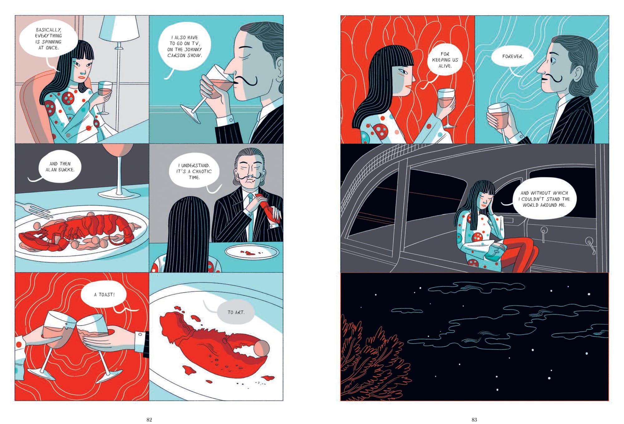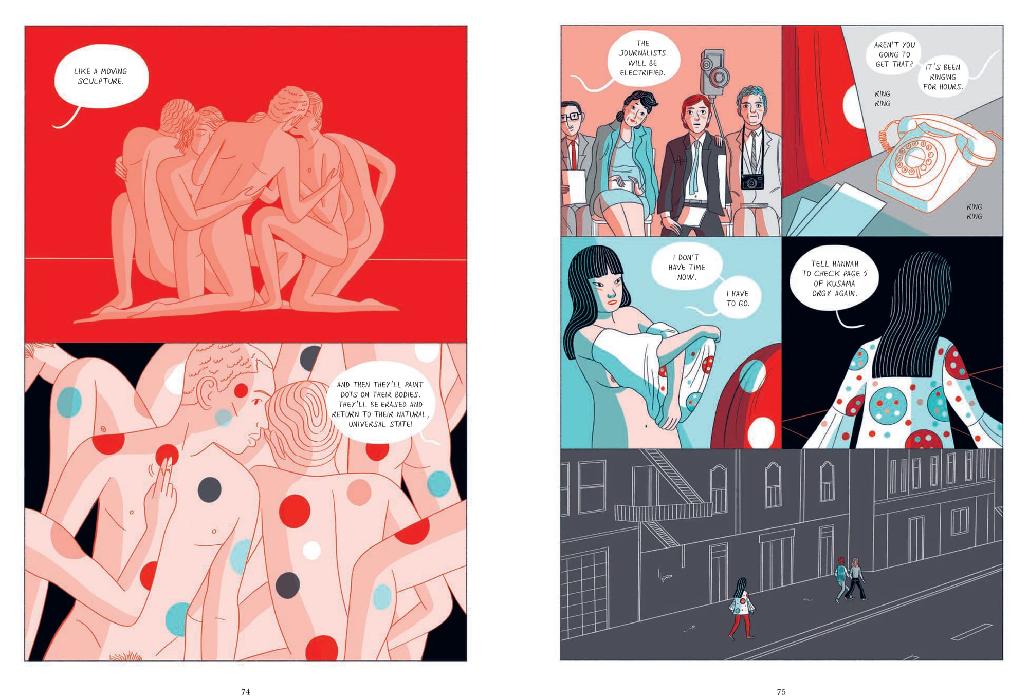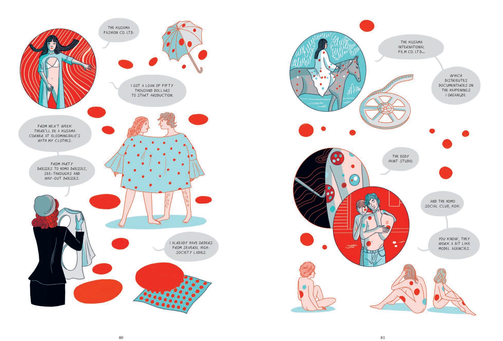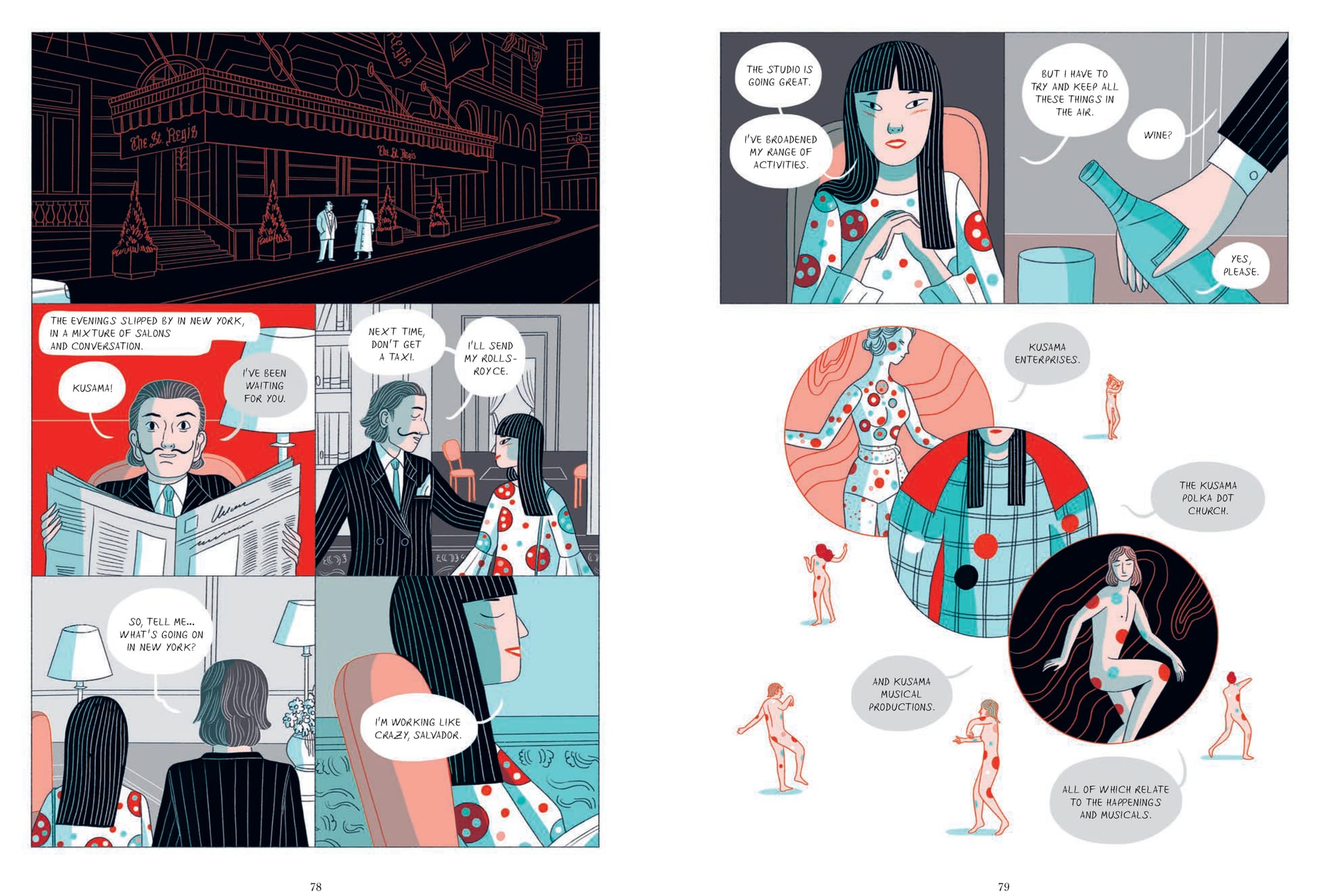 In the excerpt below, Macellari time travels to Kusama’s life in 1960s New York City, when the artist became “the high priestess of love and pacifism.” In joyous illustrations, Macellari recreates the artist’s “polka dot happenings” and “Body Festivals,” in which naked performers were covered in Kusama’s signature, mesmerizing dots. We’re also treated to imaginings of Kusama’s dinner dates with none other than her good friend, the artist Salvador Dalí.