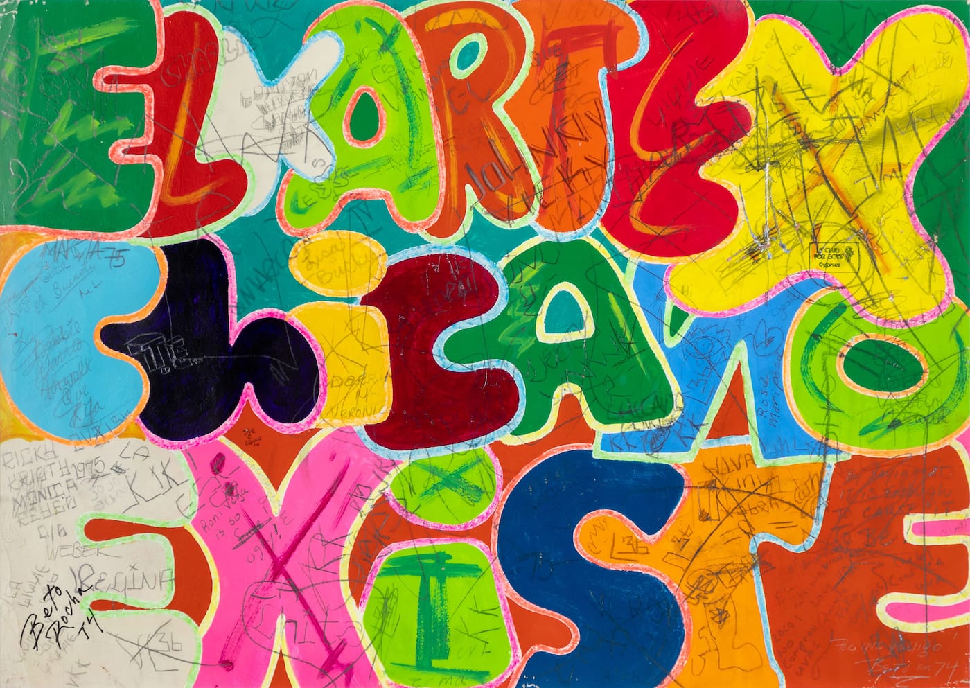 One of the first works in L.A. Memo: Chicana/o Art From 1972-1989 at LA Plaza de Cultura y Artes is “El Arte Chicano (Color)” (1974), a small, vibrant text painting by Roberto “Beto” de la Rocha (father of Rage Against the Machine frontman Zack de la Rocha). In graffiti-esque bubble letters, the work proclaims simply: “El Arte Chicano Existe” (Chicano Art Exists). The phrase is covered with the signatures of other Chicana/o artists, making the work a statement of collective solidarity. Given the rising profile of Latina/o art over the past several years — with a recent version of the Getty’s Pacific Standard Time initiative dedicated to the connection between Los Angeles and Latin America, and last week’s long-awaited opening of the Cheech Marin Center for Chicano Art & Culture in Riverside — it may seem like an obvious conclusion. However, the fact that de la Rocha felt that the existence of his art needed to be professed just affirms how different the cultural climate was in the US, and even in LA, 50 years ago.