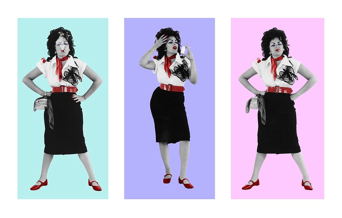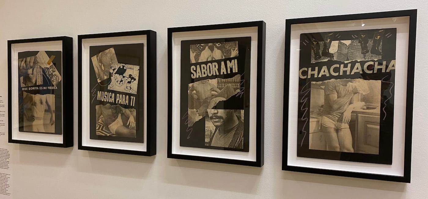 Joey Terrill and Teddy Sandoval offer queer Chicano visibility through appropriation and collage. Sandoval’s untitled xerox collage from 1977–79 sandwiches a male figure taken from a fashion magazine between two macho, mustachioed hunks, enlisting him as an ally in queer solidarity. Terrill utilizes a punk cut-and-paste technique in his 1977 collages that combine Spanish titles of heterosexual love songs with homoerotic imagery, cartoons, and Hollywood film stills.