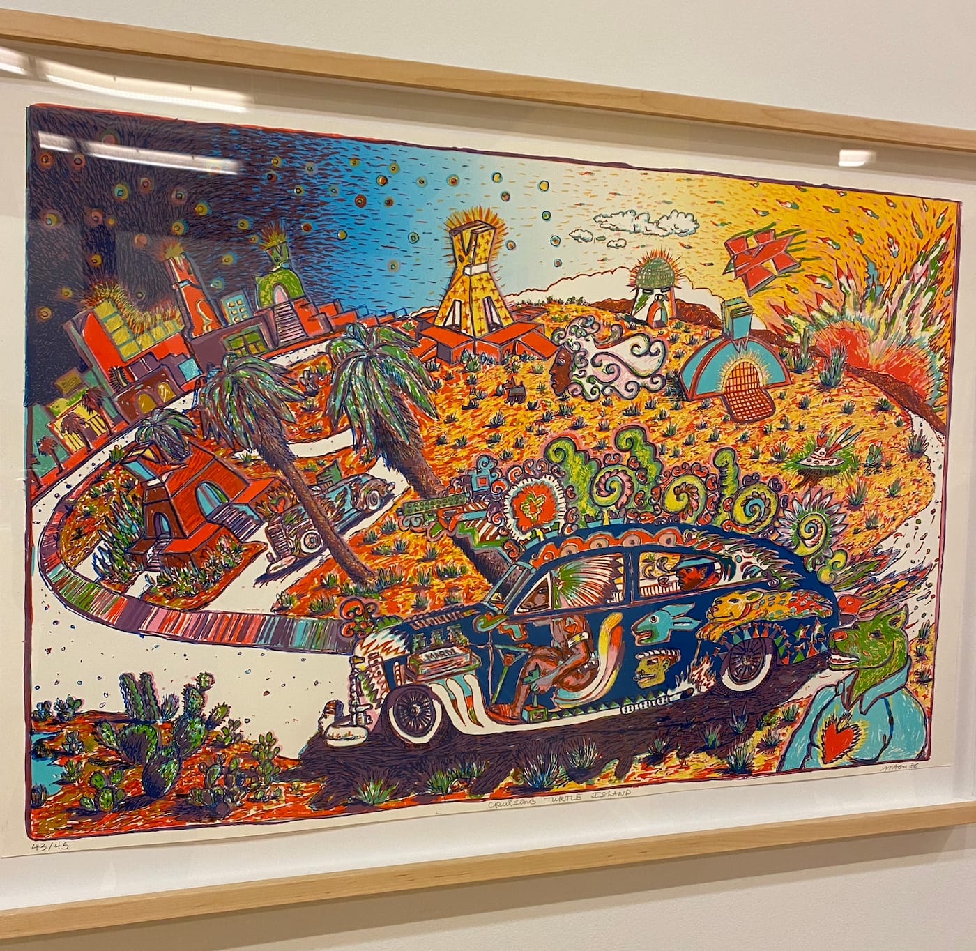 Although L.A. Memo features a diverse range of media, printmaking features prominently. During the Chicano Movement and the Moratorium, printmaking emerged as a democratic medium that could inexpensively and quickly disseminate ideas and images. Several prominent artists are represented here through prints, including Gronk, Herrón, Barbara Carrasco, and John Valadez. Many of these were printed by Self-Help Graphics, an influential community-based printmaking studio founded in 1973, although this is not highlighted in any of the exhibition text, a notable oversight given the role that Self-Help Graphics has played in producing and promoting Chicana/o art.