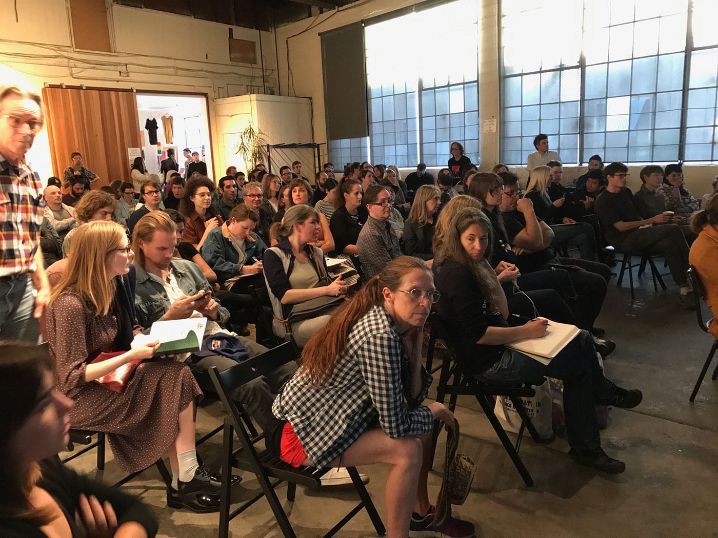 The protesters “marched into the meeting, chanting, ‘a gentrifying space is not a safe space,’ and it appeared that the audience attempted to drown them out by clapping,” Mandiberg told Hyperallergic via email. “They didn’t stop until someone shouted, ‘let them talk.’
