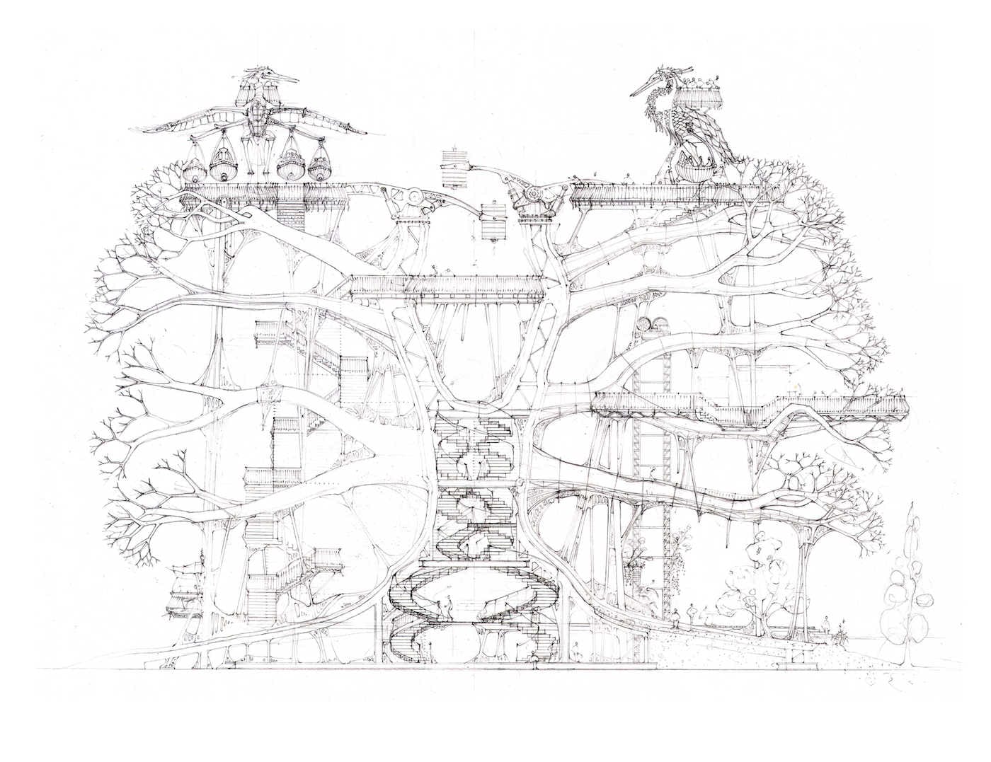 A French theatrical troupe known for enacting dramatic performances with giant kinetic beasts, from spiders to dragon-horses, is working on its most ambitious piece of public art yet. The Heron’s Tree (l’Arbre aux Hérons) is an urban garden designed as a 114-foot-tall, 165-feet-wide tree, poised to rise in the western French city of Nantes. Comprised of winding steel paths punctuated by large automata of creatures, it is an extraordinary feat of fantastical architectural and interactive sculpture that recalls the Hanging Gardens of Babylon.