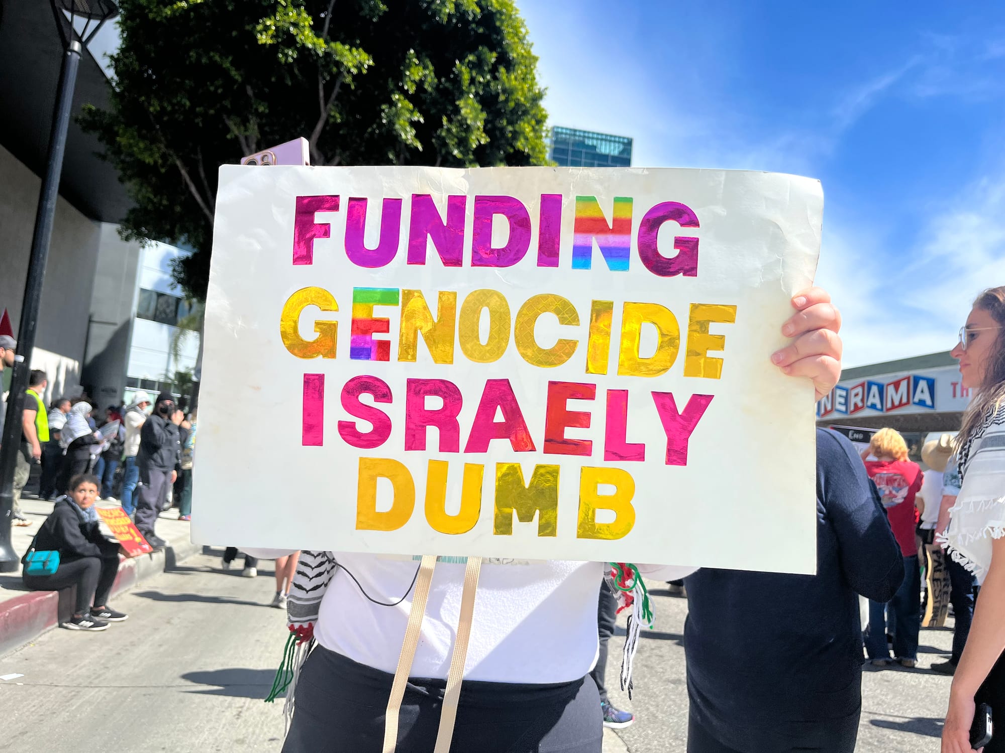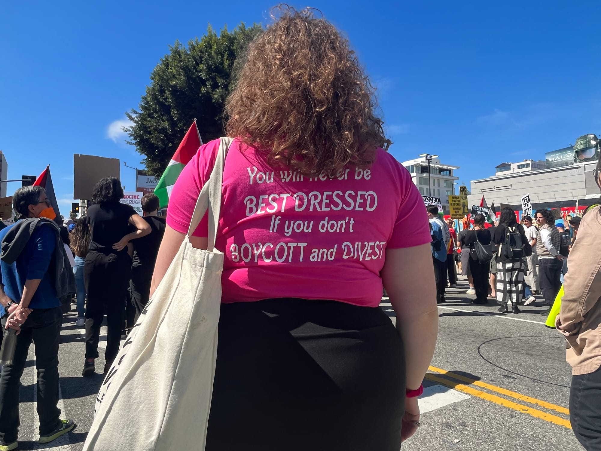 By 2pm, the crowd was marching along Sunset Boulevard, yelling “Ceasefire! Now!” and “Palestine is not for sale” at intervals. Signs read “While you’re watching, bombs are dropping,” referencing the Oscars ceremony starting in just a few hours.