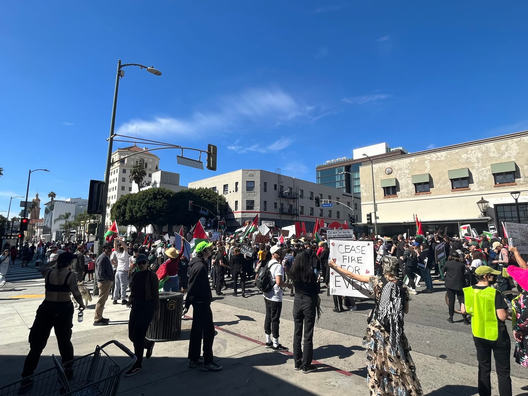 By 2:30pm, police presence increased significantly as marchers approached the Oscars venue. A barricade of officers blocked the street at Las Palmas Avenue as protesters paused and sang “Ceasefire Now, Free Palestine” in front of the Blessed Sacrament School.