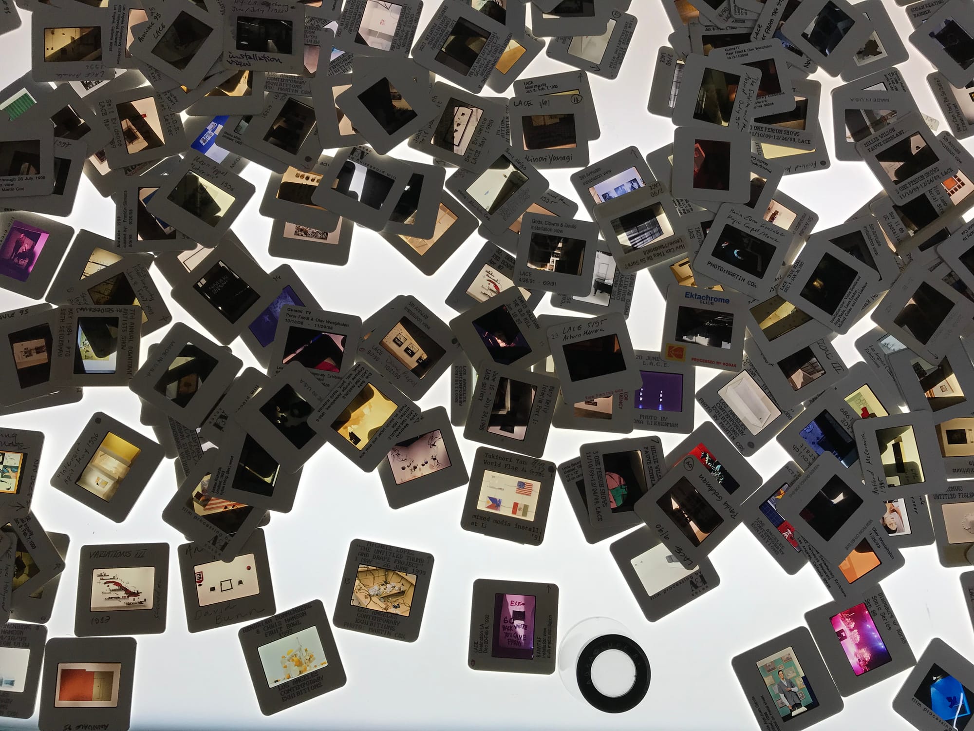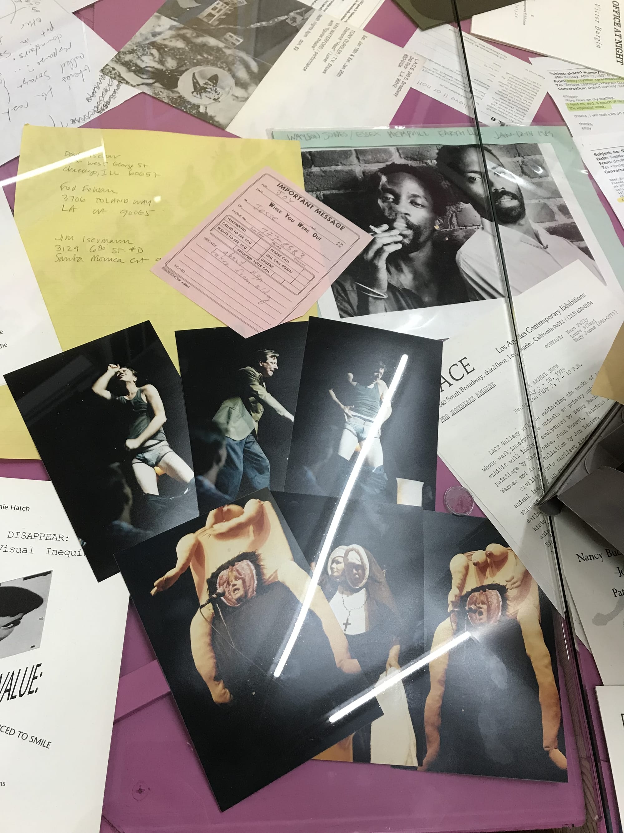 The roughly 450 linear feet of material acquired by the Getty, comprised of photographs, letters, collateral, video tape, and other records, is the result of decades of informal and formal efforts by LACE staff members, interns, and volunteers to preserve the space’s history. To put the size of the archive in perspective, the artist Allan Kaprow’s archive at the Getty — an example of a typically large archive — is about 300 linear feet.