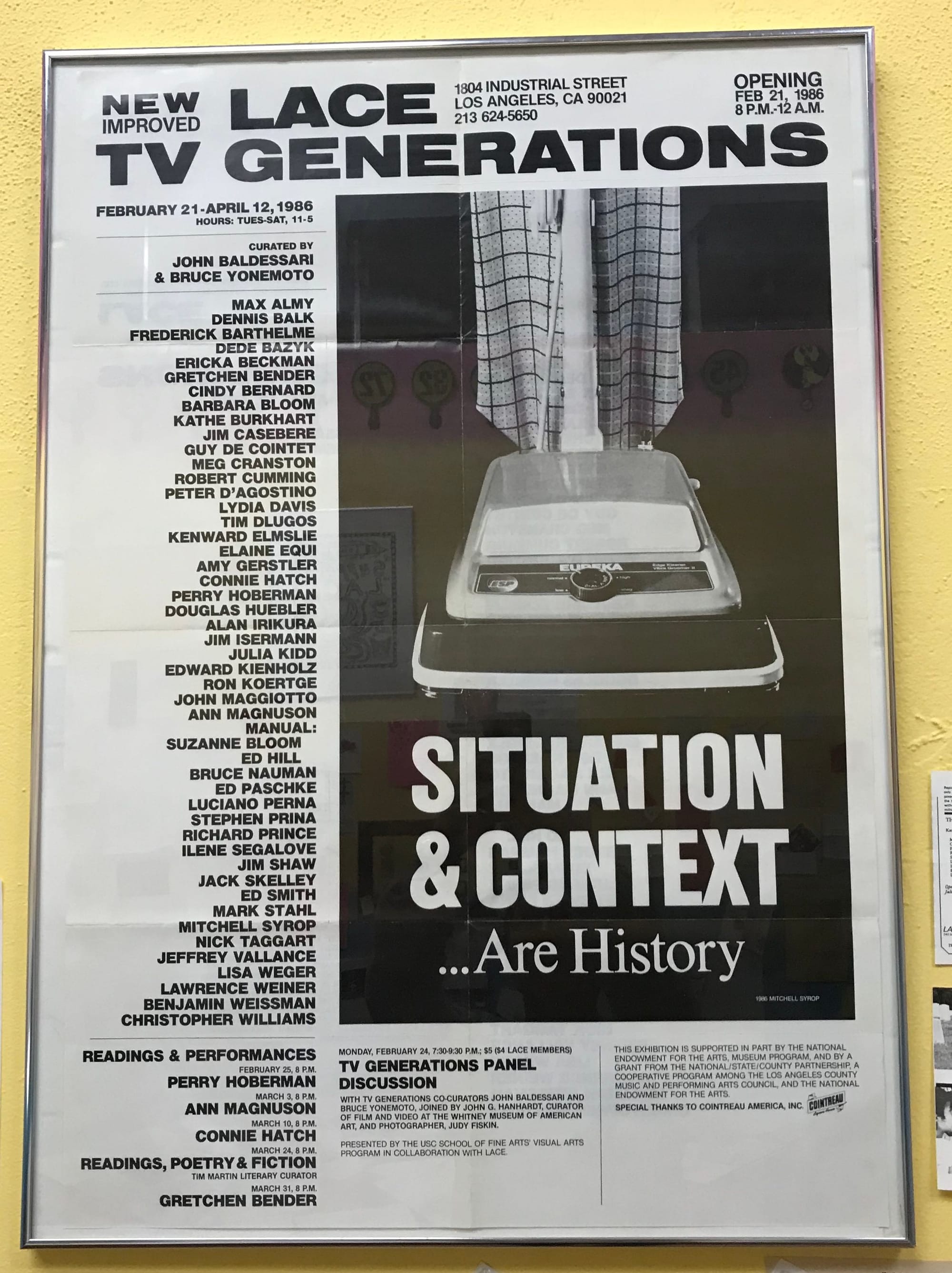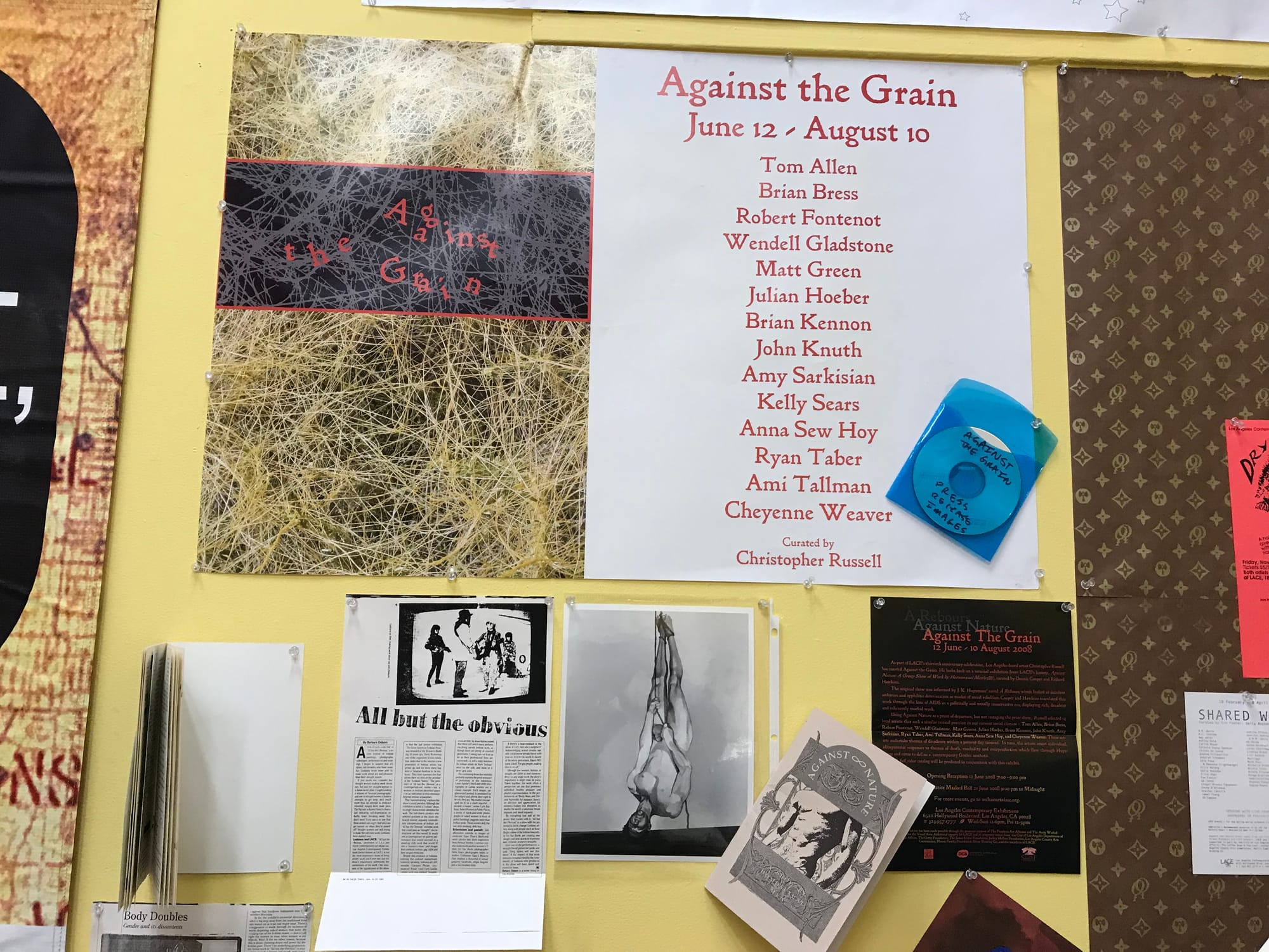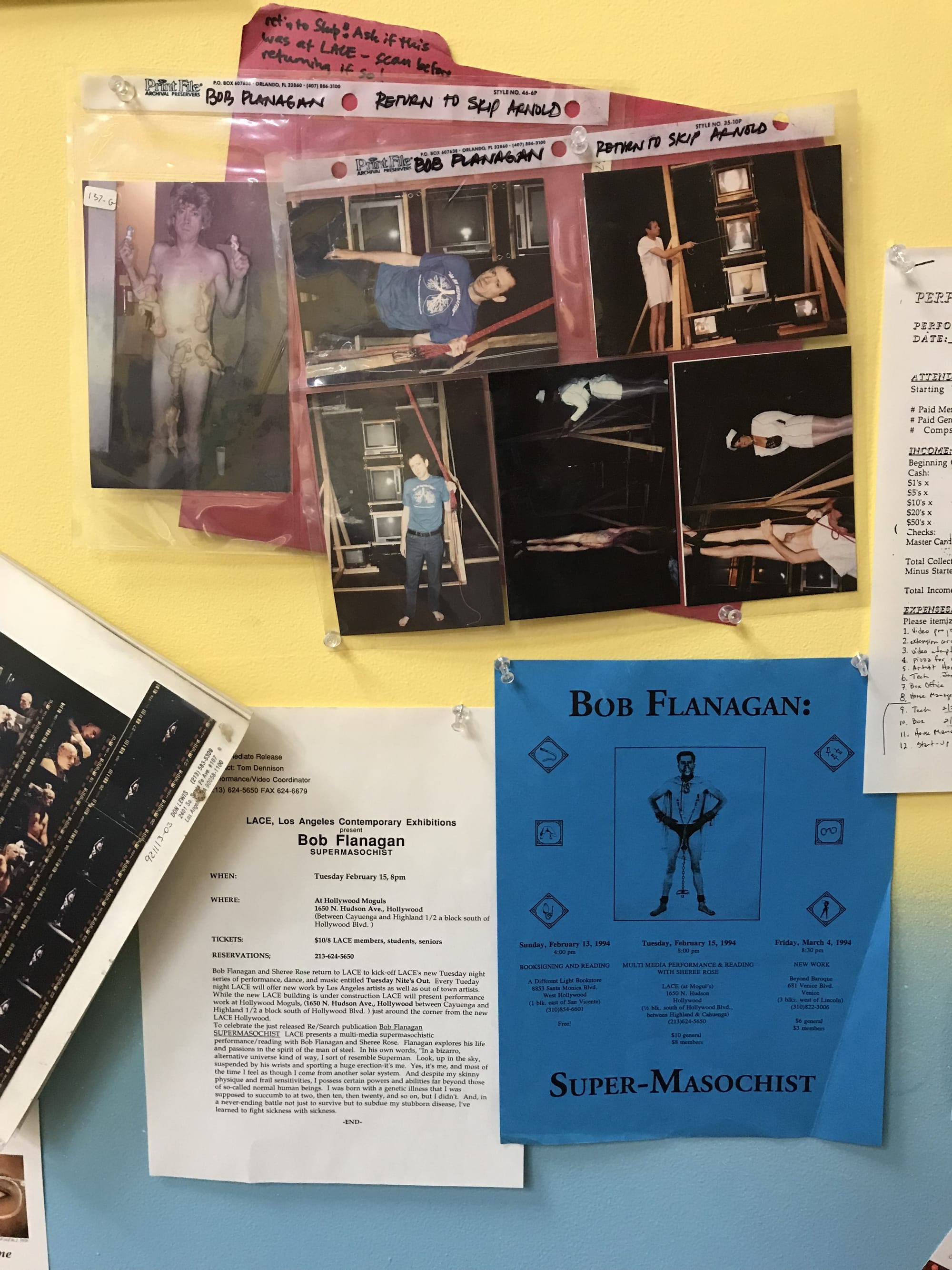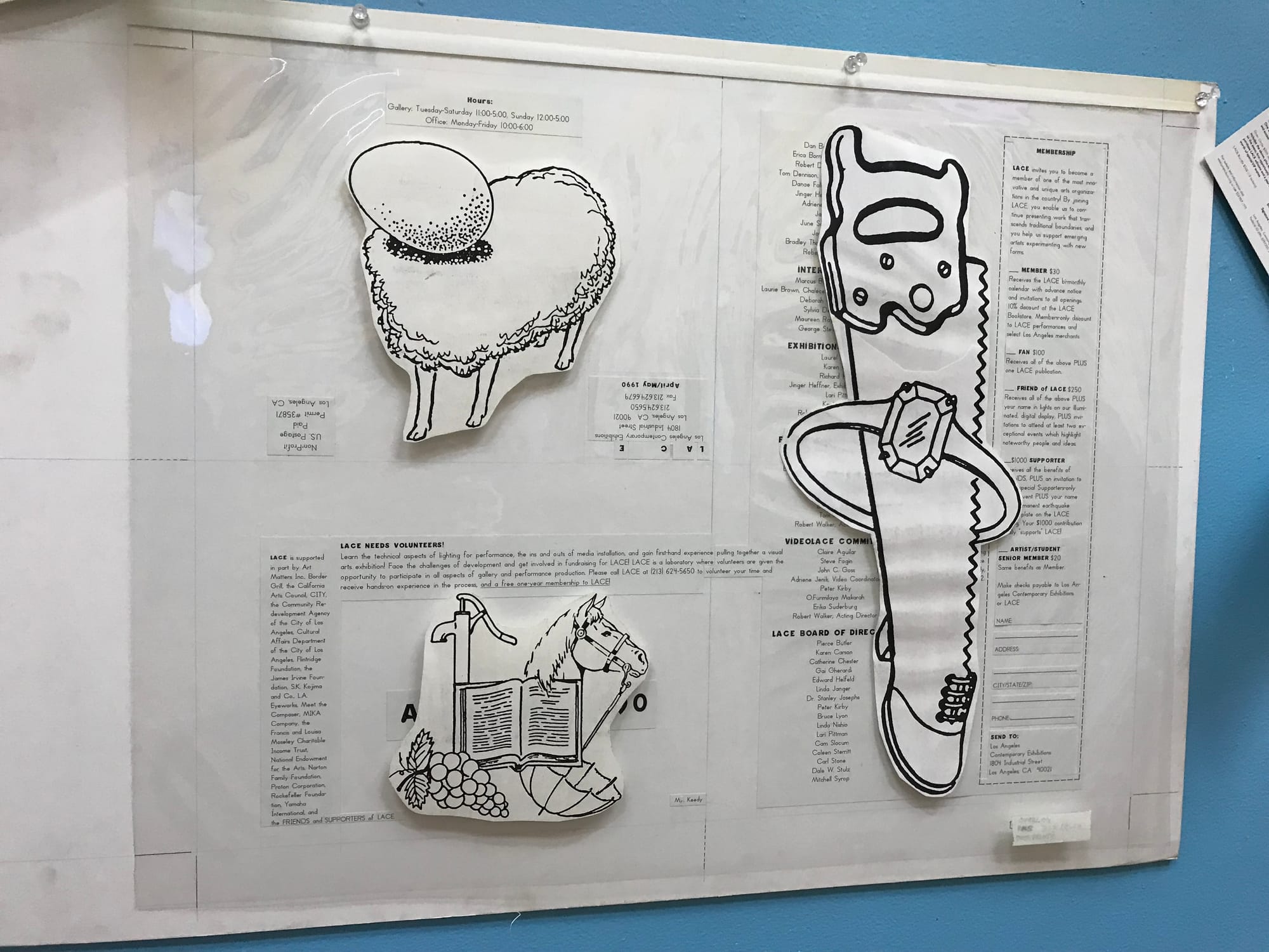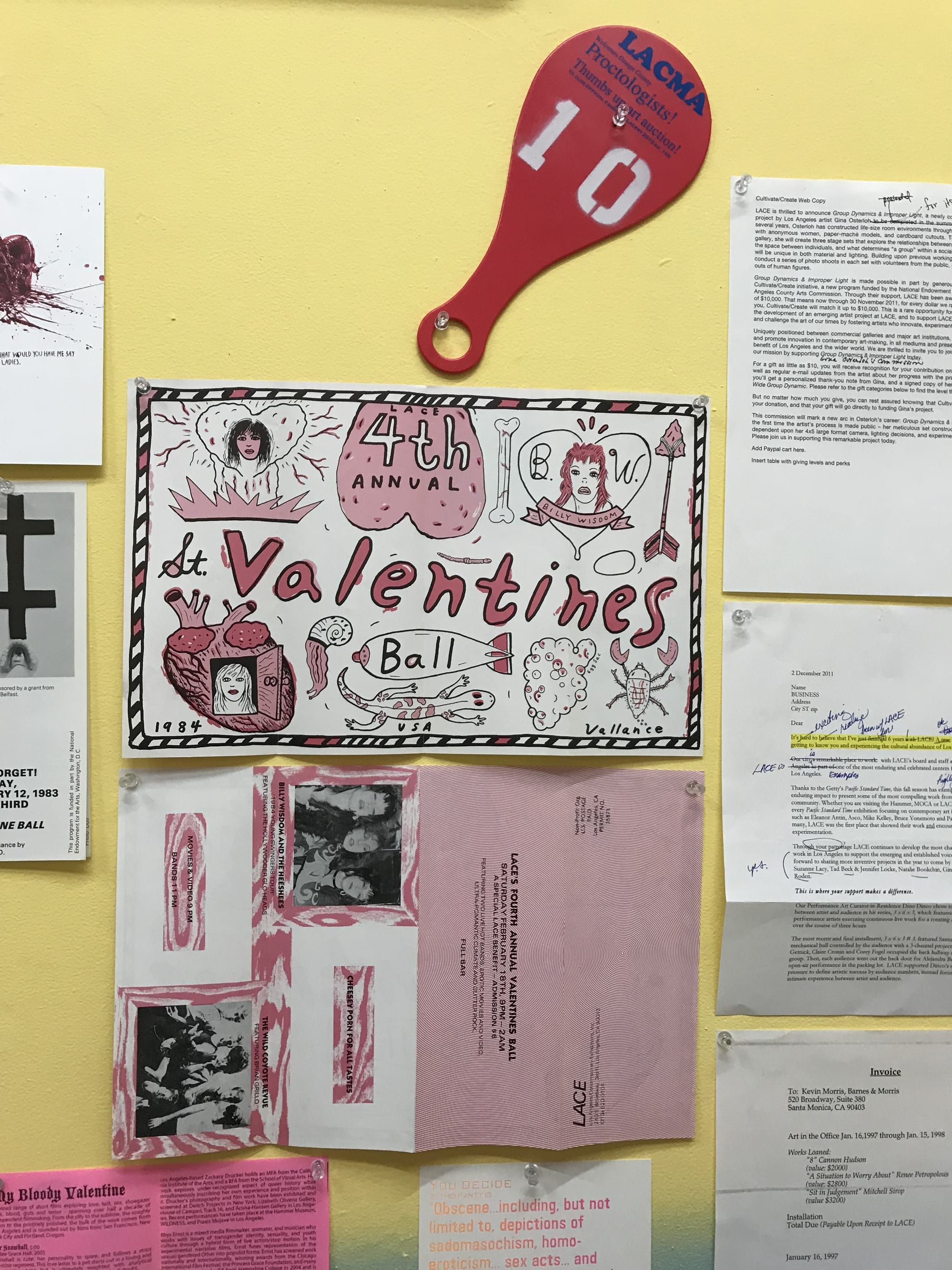 Matias Viegener, an artist and critic who has been part of LACE’s history for almost 30 years, got a chance to dig through the archive, which until recently was housed in LACE’s attic, and curate a small sampling of materials for his exhibition, The Archival Impulse: 40 Years at LACE. The exhibition, currently on display, gives a sense of the breadth and scope of the archive, with a number of surprising objects that tell the organization’s story.